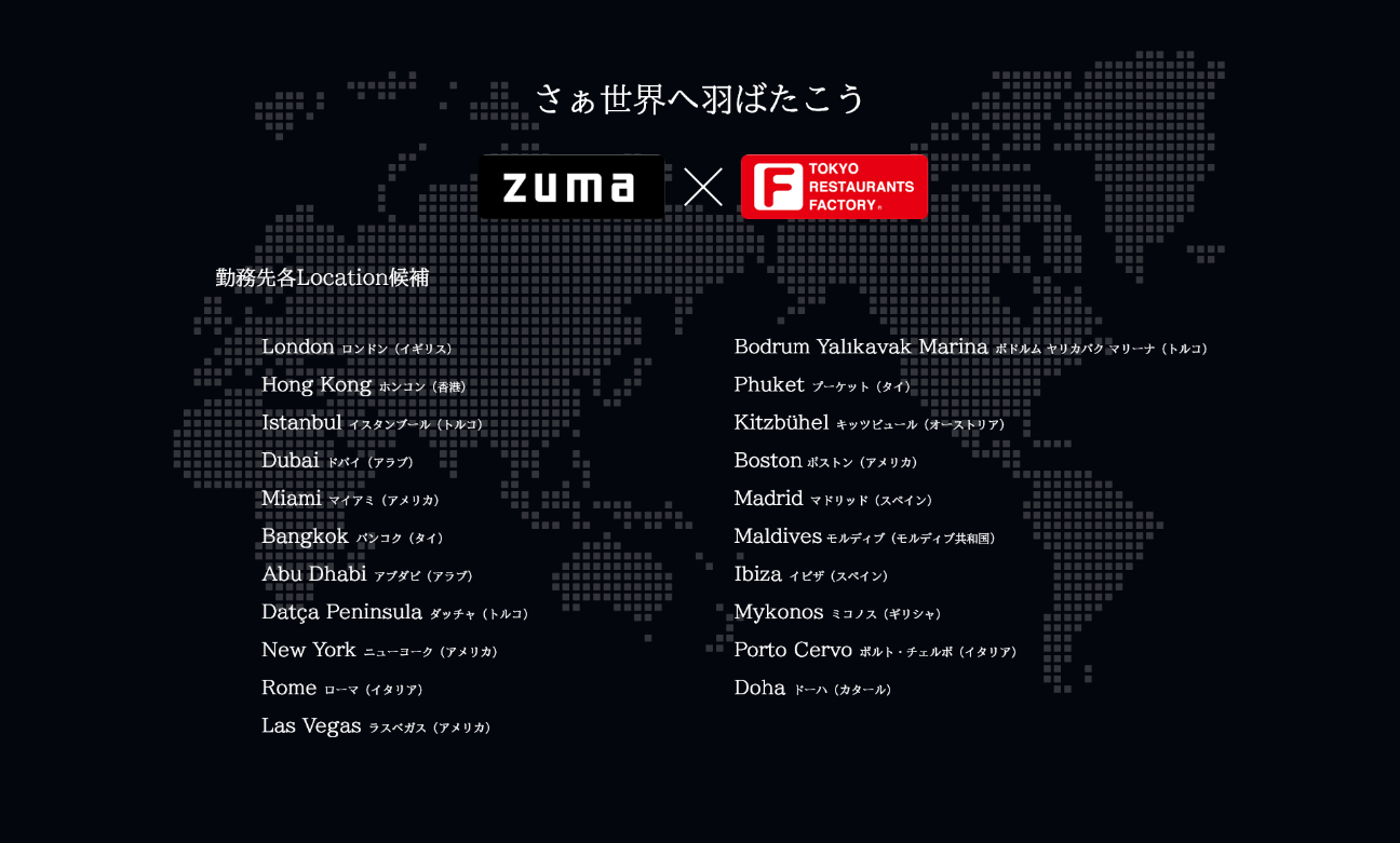 世界中に店舗を展開するzumaと東京レストランツファクトリー株式会社が 海外で働く夢の後押しをします!
