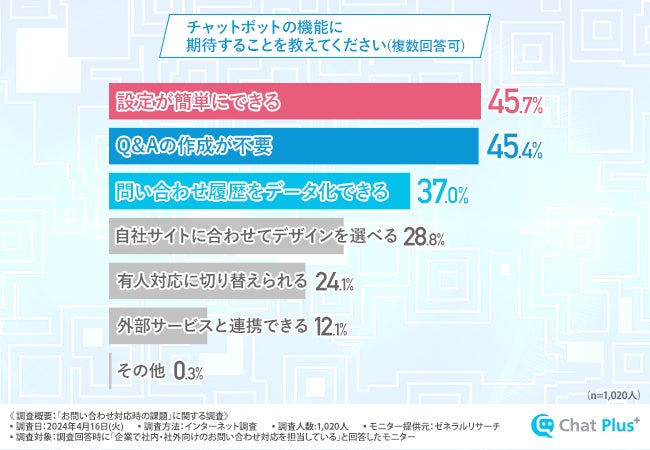 チャットボットの機能に期待することとして、約半数が「設定の容易さ」を挙げています。