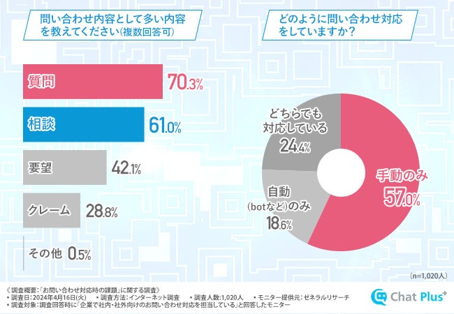 そこで今回、チャットプラス株式会社(https://chatplus.jp/)は、企業でお問い合わせ対応を担当している方を対象に、「お問い合わせ対応時の課題」に関する調査を実施しました。