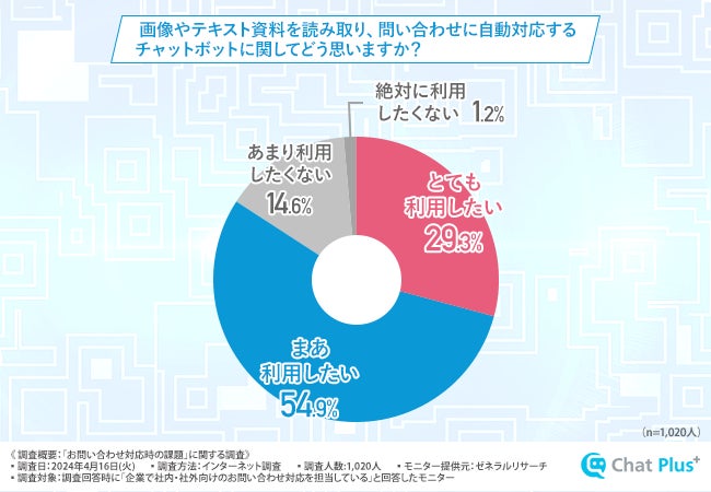 そこで、「画像やテキスト資料を読み取り、問い合わせに自動対応するチャットボットに関してどう思いますか? 」と質問したところ、『とても利用したい(29.3%)』『まあ利用したい(54.9%)』『あまり利用したくない(14.6%)』『絶対に利用したくない(1.2%)』という回答結果になりました。
