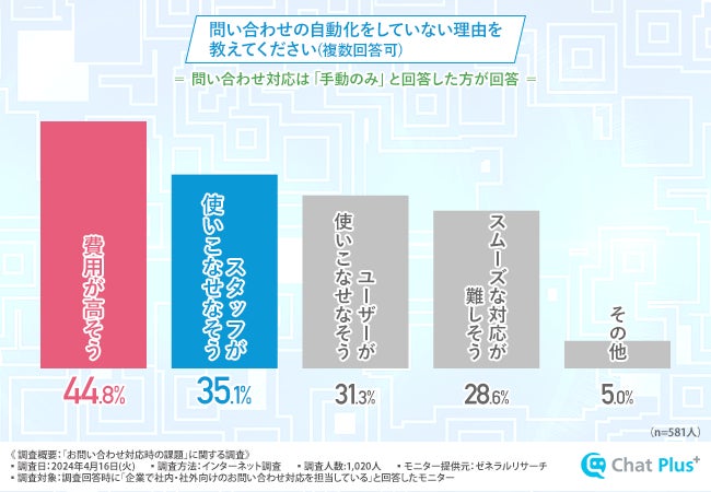 前述の質問で、問い合わせ対応は「手動のみ」と回答した方に「問い合わせの自動化をしていない理由を教えてください(複数回答可)」と質問したところ、『費用が高そう(44.8%)』と回答した方が最も多く、次いで『スタッフが使いこなせなそう(35.1%)』と続きました。