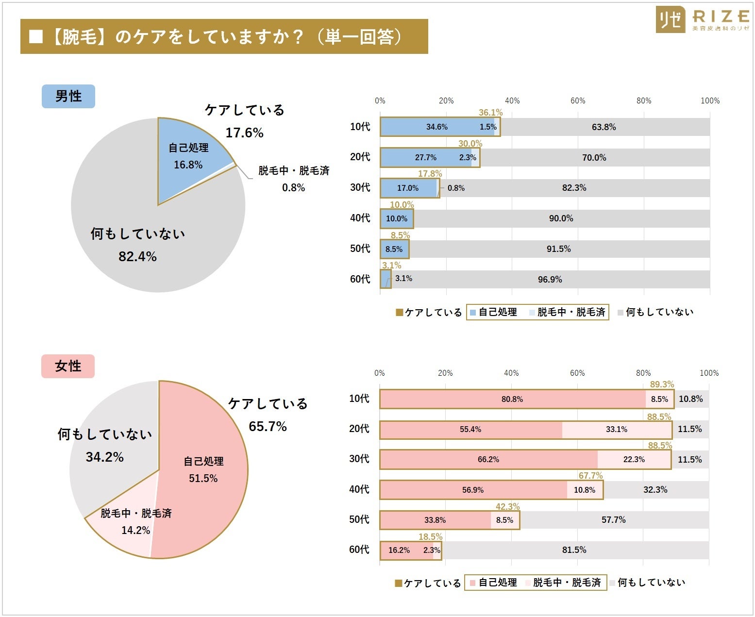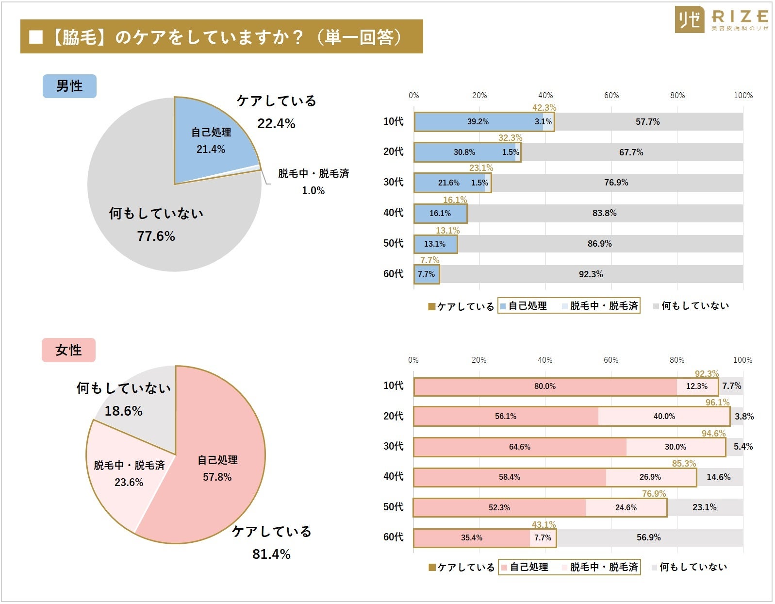 - ②【脇毛】男性2割に対し、女性の8割以上がケアをしている
