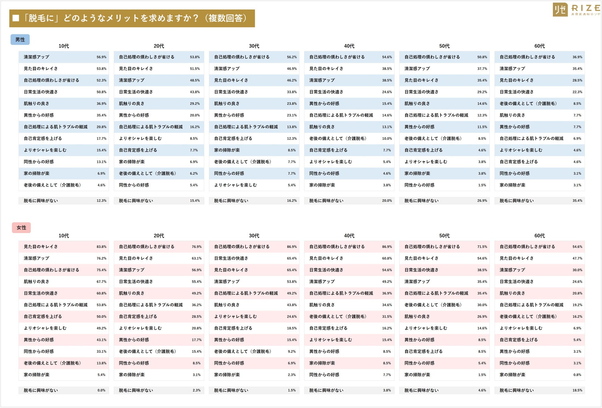 - ⑨【脱毛に求めるメリット】男女ともに「自己処理の手間が省ける」