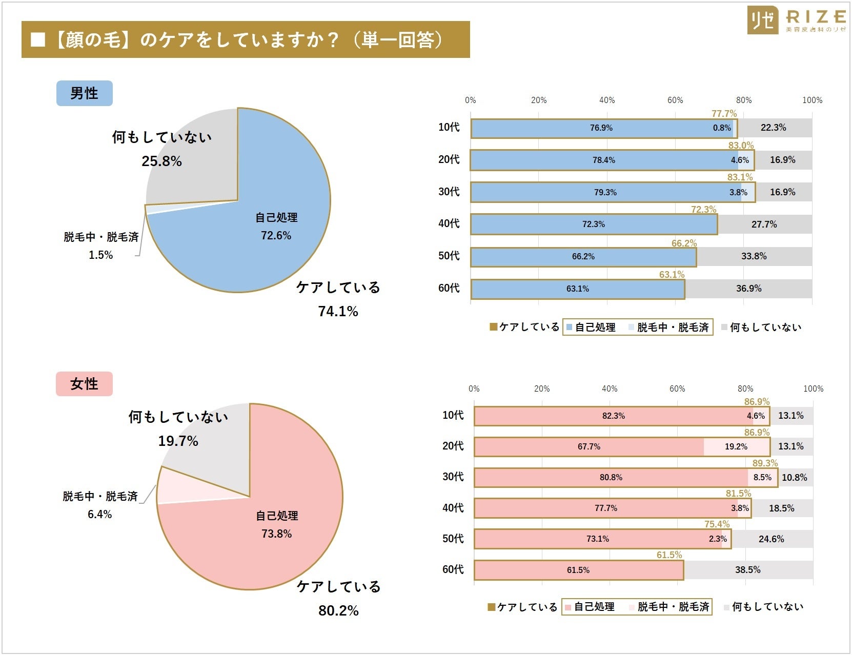 - ①【顔の毛】男性7割以上、女性8割がケアをしている