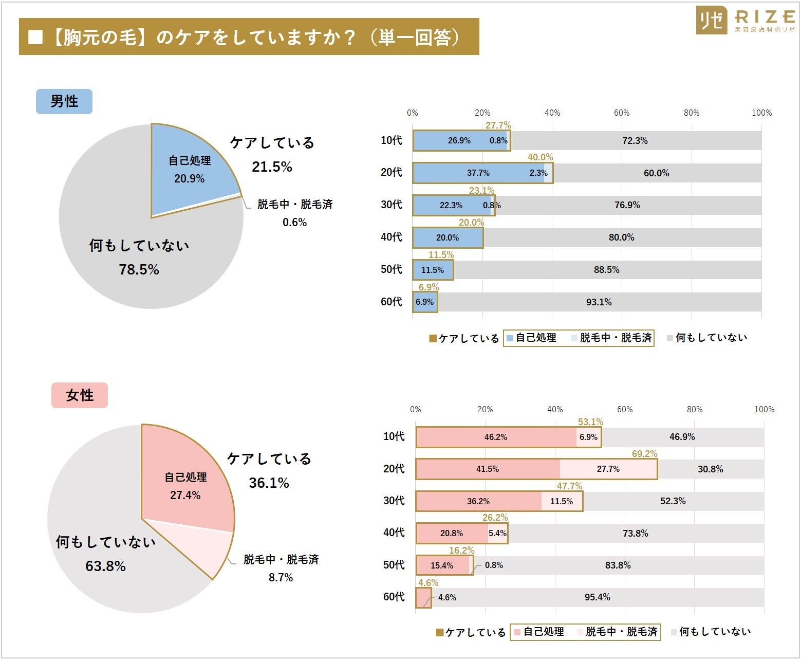 - ⑤【胸元の毛】20代男性の4割、20代女性の約7割のケア率が最多に