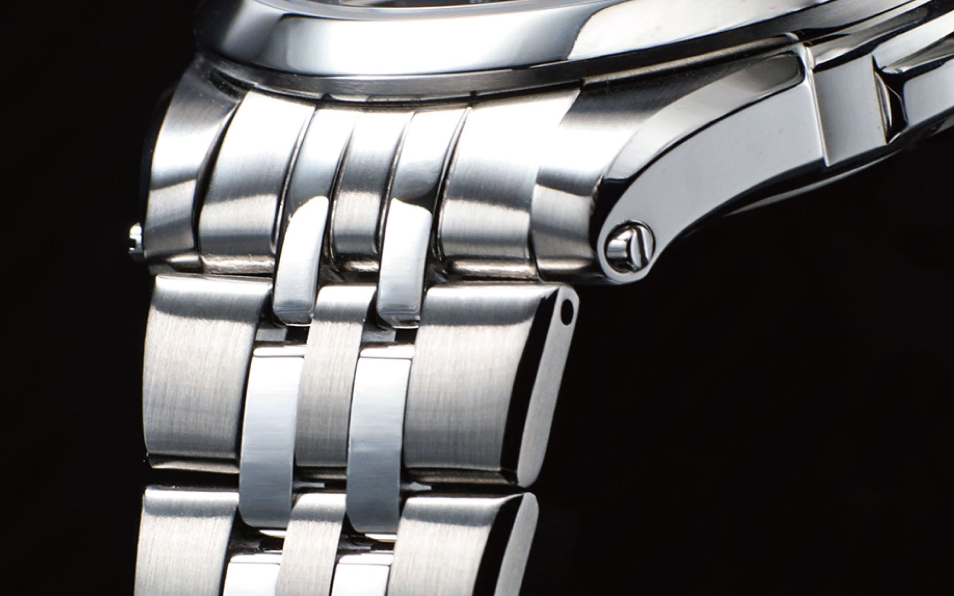 ブレスレットは、ヘアラインとポリッシュを丹念に磨き分けた高級感あふれる5連仕様。立体感のある仕上げが、手元に確かな存在感と上質さをもたらします。バックルには、着脱がスムーズで安心感のある3つ折れ式バックルを採用し、快適な装着感を実現しています。