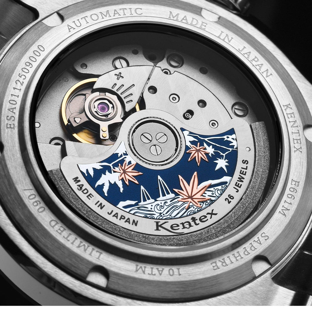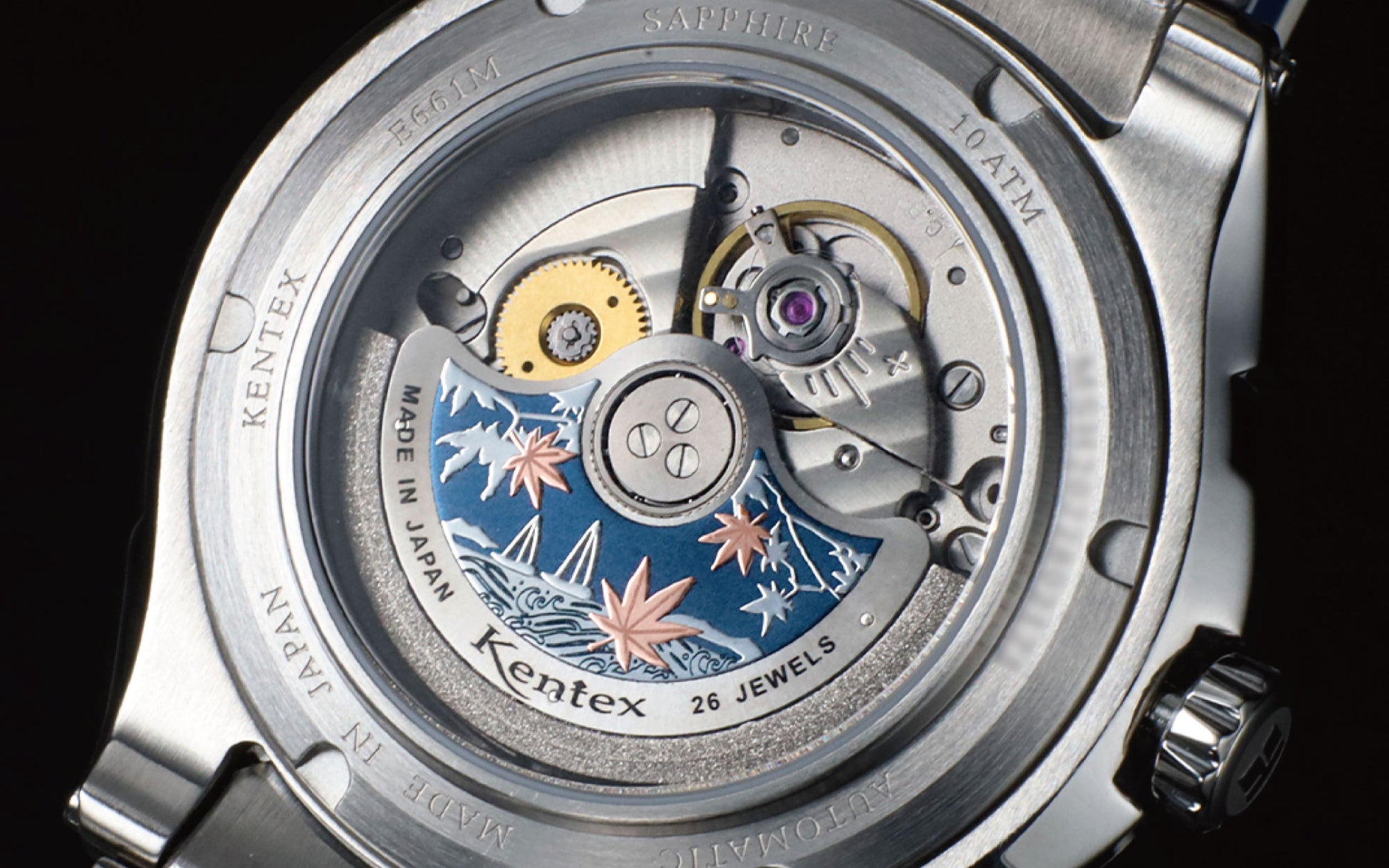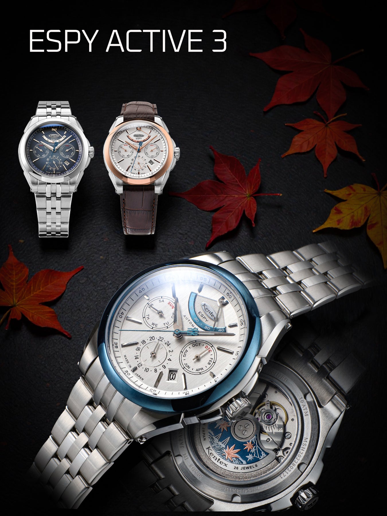国産ハイビート自動巻きムーブメントを搭載した、ケンテックスのドレススポーツライン「ESPY Active 3」。パワーリザーブ、月・日・曜日表示を備えた本格マルチカレンダーを、洗練されたΦ41mmケースに収めました。両面カーブサファイアガラスとヘアライン文字盤が上質な表情を生み、10気圧防水により実用性も確保。裏スケルトンから覗くローターには、日本の美意識を映した紅葉モチーフをあしらい、機械式時計ならではの鼓動と情緒を静かに語ります。力強さと品格を兼ね備えた、大人のための機械式時計。