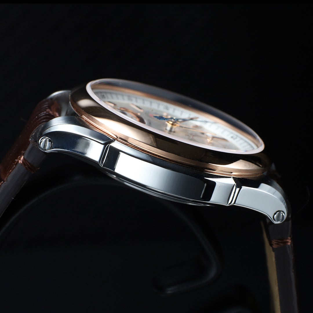 文字盤は、繊細なヘアライン仕上げを施したシルバーダイヤルに、ローズゴールドのインデックスが優しく調和し、柔らかな輝きの中に上品で温かみのある気品を感じさせるデザイン。丹念に面取りを施したパワーリザーブインジケーターの上質感と、ブルースティールの秒針が美しく映える、エレガントなモデル。