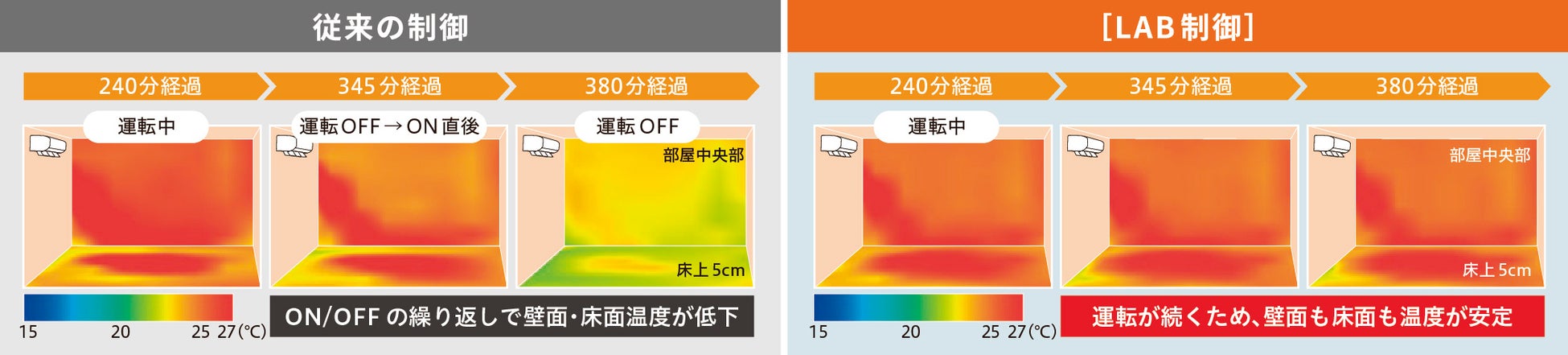 暖房時:外気温7℃、設定温度23℃、室温安定時の1時間あたりの積算消費電力量は、従来の制御295Wh、LAB制御250Wh。冷房時:外気温39℃、設定温度27℃、室温安定時の1時間あたりの積算消費電力量は、従来の制御320Wh、LAB制御283Wh。