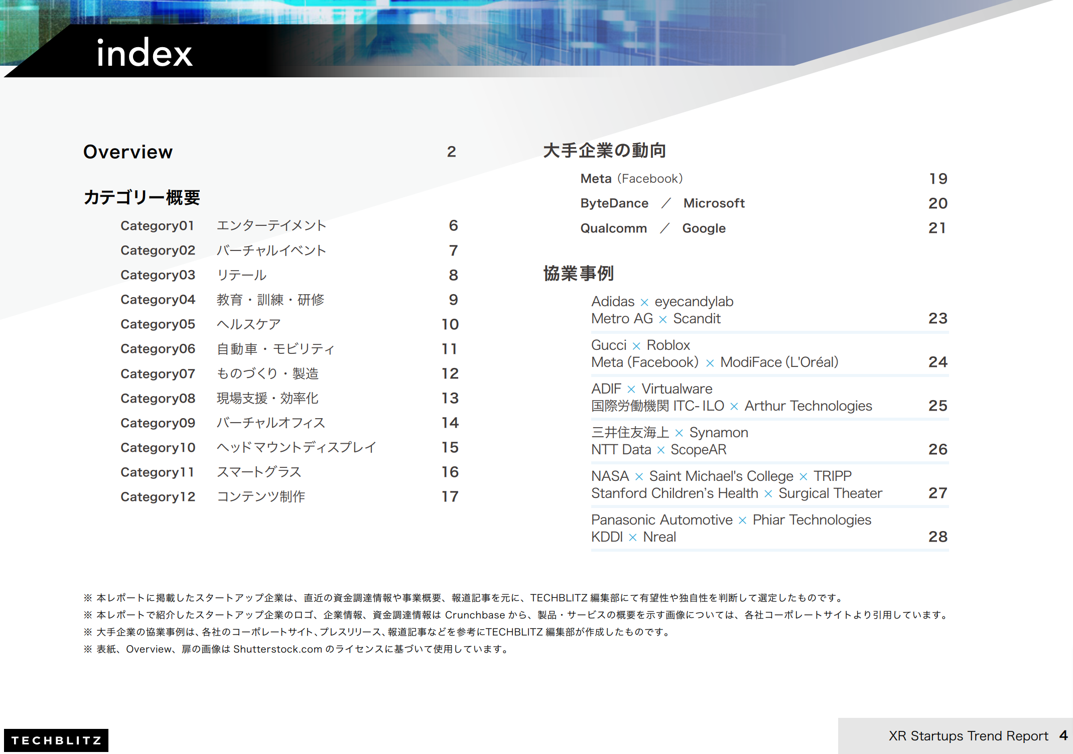 本レポートでは、エンターテイメントからヘルスケアまで生活に身近な場面でのXR、ものづくりからバーチャルオフィスなどのビジネスユース、さらにXRハードウェアとコンテンツ制作ツールについて、カテゴリ別にトレンドと有望なスタートアップをご紹介します。また後半ではMetaをはじめとする大企業の動向や海外スタートアップと大企業との協業事例を掲載しています。