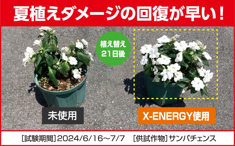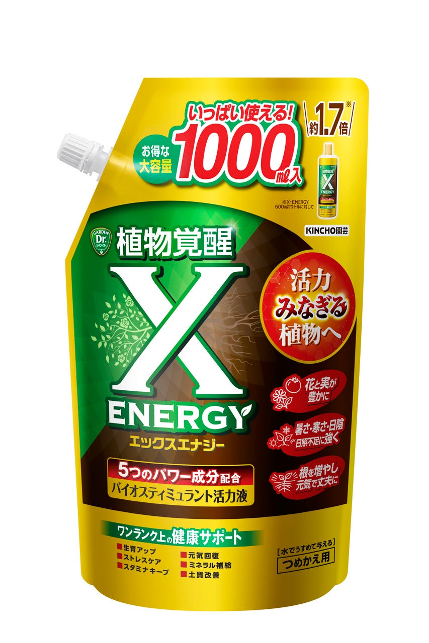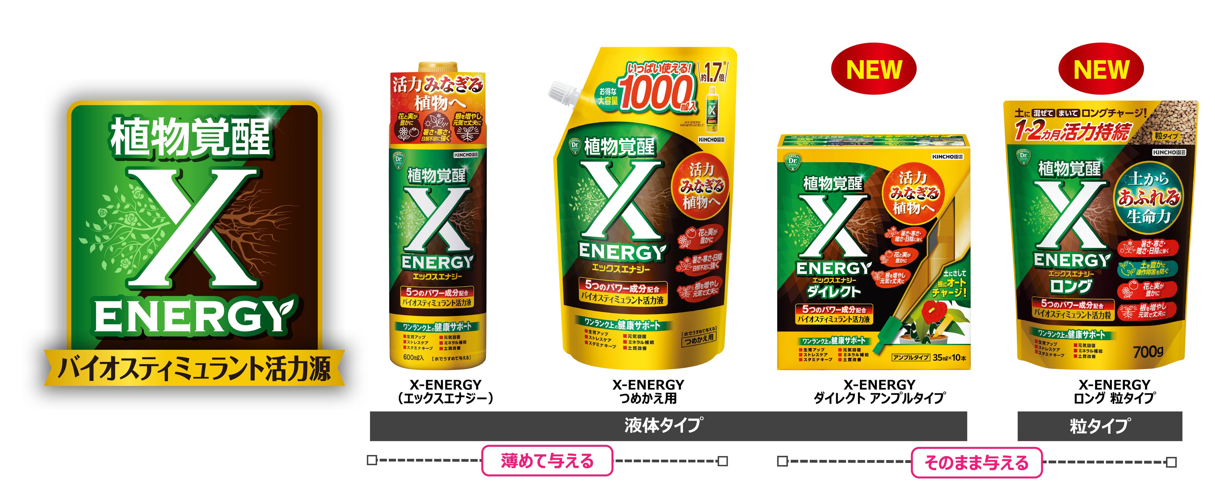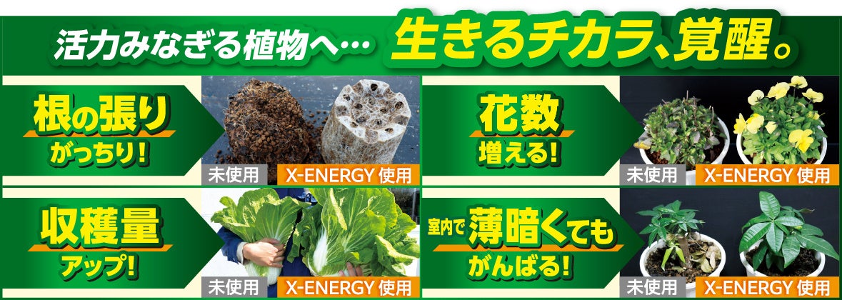 2025年春の「X-ENERGY」を発売以降、ユーザーの声を受けて同年に「X-ENERGY つめかえ用」を発売。さらに2026年春には、広い面積にもまくだけ、まぜるだけ、効果長続きの「X-ENERGYロング 粒タイプ」、いそがしい人にも最適な土にさすだけの「X-ENERGYダイレクト アンプルタイプ」の2品を新発売。家庭菜園、観葉植物、オフィス、店舗などあらゆる使用環境に対応するラインナップとなりました。