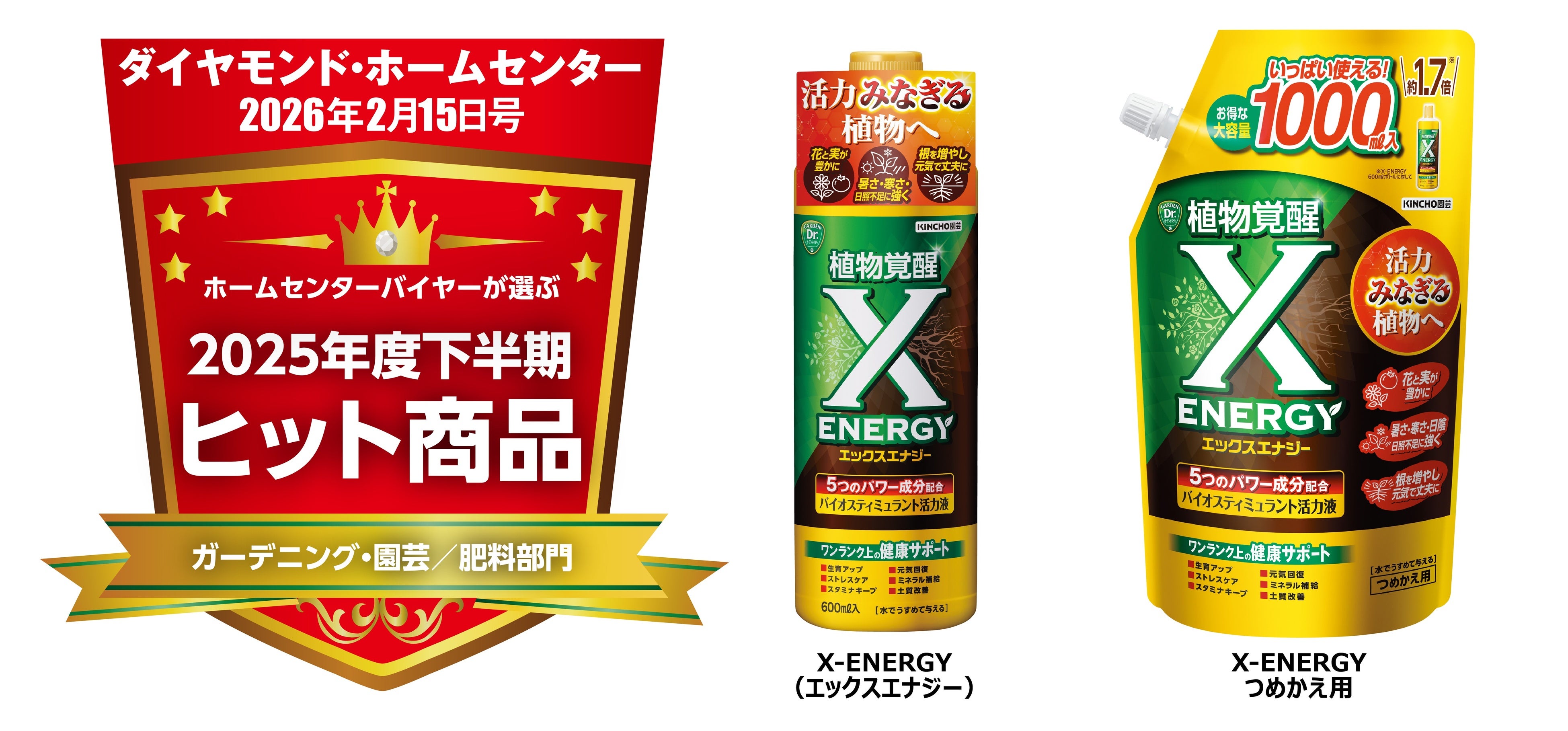 家庭園芸用薬品・肥料等を製造販売するKINCHO園芸株式会社(本社:東京都中央区/代表取締役社長: 森本 義之)が2025年6月から販売を開始した、植物を覚醒させるバイオスティミュラント活力液「X-ENERGY つめかえ用」がダイヤモンド・ホームセンター誌「ホームセンターバイヤーが選ぶ2025年度下半期ヒット商品」に選出・表彰されました。本企画は、ホームセンターの店頭において業績に高い貢献をした新商品に対するアンケート評価に基づくものです。2025年度上半期ヒット商品に選出された「X-ENERGY(エックスエナジー)」に続き、同シリーズでの年間連続受賞となりました。