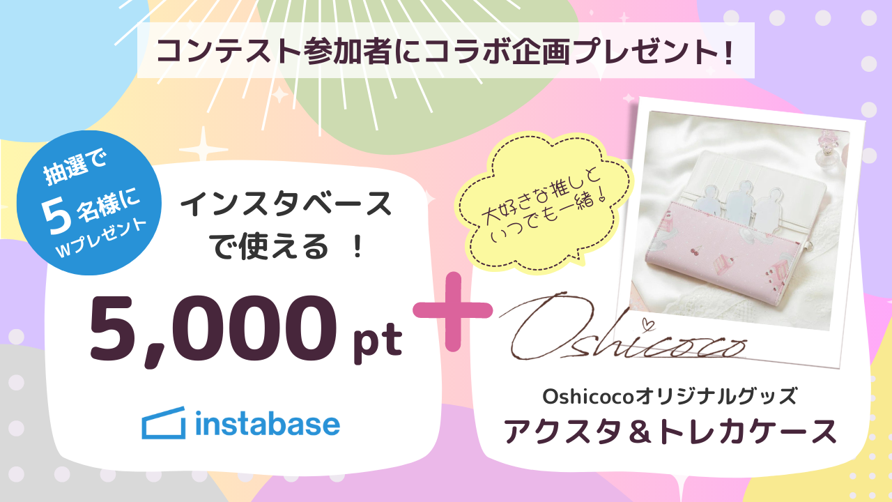 コンテスト参加者の中から抽選で5名様に、インスタベースで使える5,000ポイントと「Oshicoco」オリジナル「アクスタ&トレカケース」をセットでプレゼントいたします。