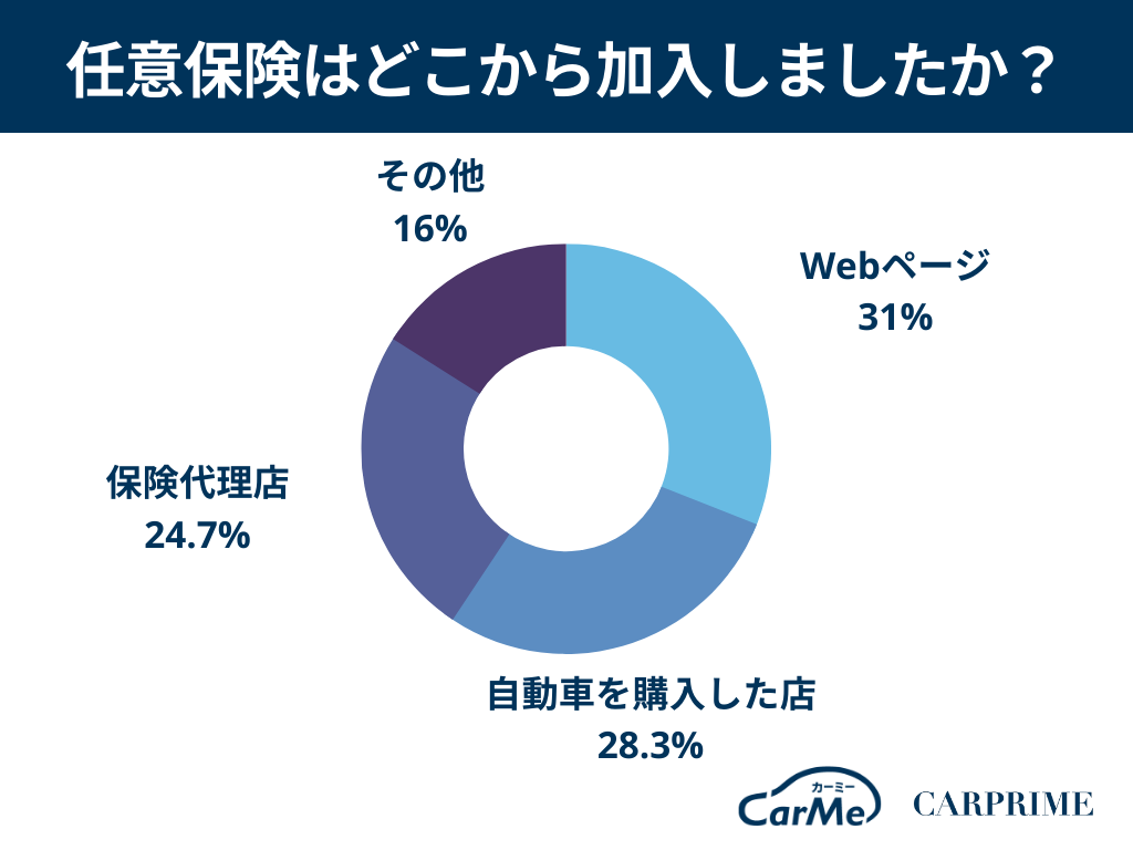 自動車を購入した店で加入する人は85名(28.3%)、保険代理店で加入する人は74名(24.7%)と少ない結果となりました。