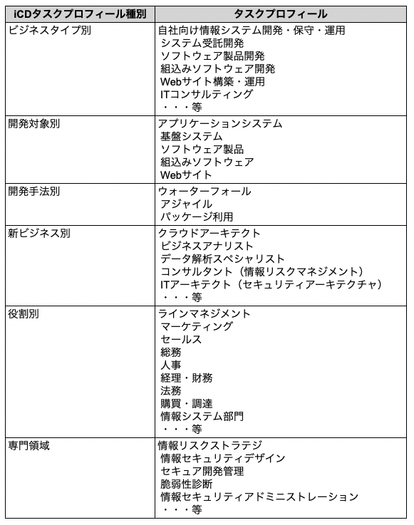 タレントパレットのスキル機能の標準テンプレートとして、iCD協会が定義する99種類のタスクプロフィール(下表)を「職種」として用意しました。テンプレートなので企業別に必要な職種を選択し、対応するスキル(タスクプロフィール)の組み合わせおよび重みづけを任意に設定して頂くことが可能です。