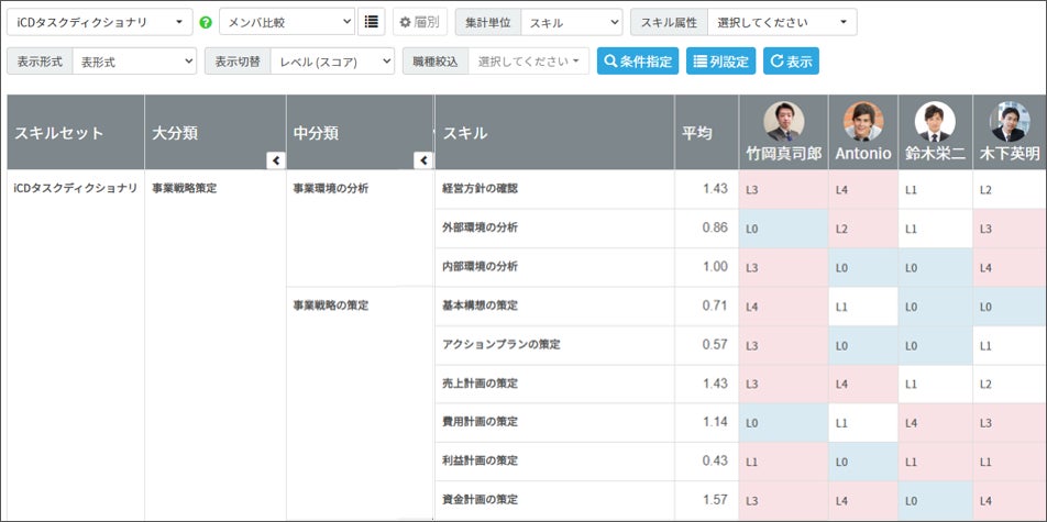 個人別のスキル習熟度のばらつきを、強みを赤色、弱みを青色で表示し一目で把握することが可能です。