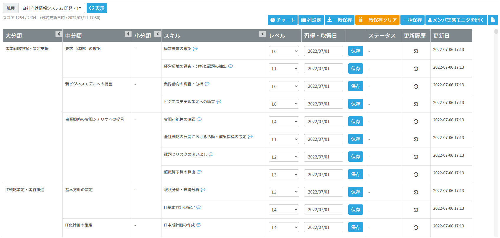 定期的にスキル回答して頂くことで、時系列でのスキルアップ状況を確認することが可能となります。
