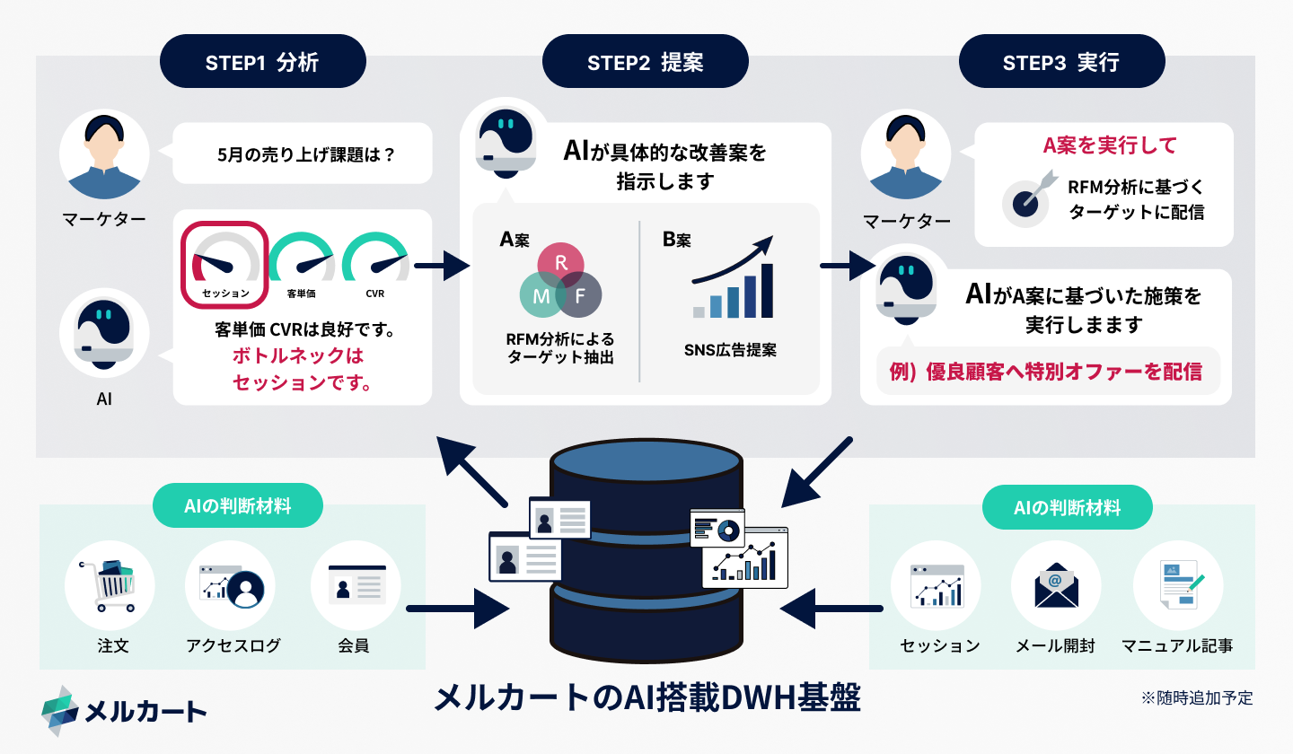 株式会社メルカート(本社:東京都港区、代表取締役社長:渡邉 章公/以下、メルカート)は、提供するクラウドECサイト構築プラットフォーム「メルカート」において、ECカートシステムとして日本で初めて※1、分析・提案・実行の全プロセスをAIがサポートする「AIエージェント一体型データウェアハウス(以下、DWH)基盤」を構築したことをお知らせいたします。本基盤は、独自開発の「メルカートインテリジェンスエンジン」とDWHがシームレスに連携。EC担当者が自然言語(日常会話)で問いかけるだけで、売上課題の特定から具体的な施策提案、さらには管理画面内での実行(会員グループ作成等)までをAIがアシストします。AIを「良き相談相手」としながら、担当者が納得感を持って迅速に意思決定を下せる、新しいEC運営の形を提案します。