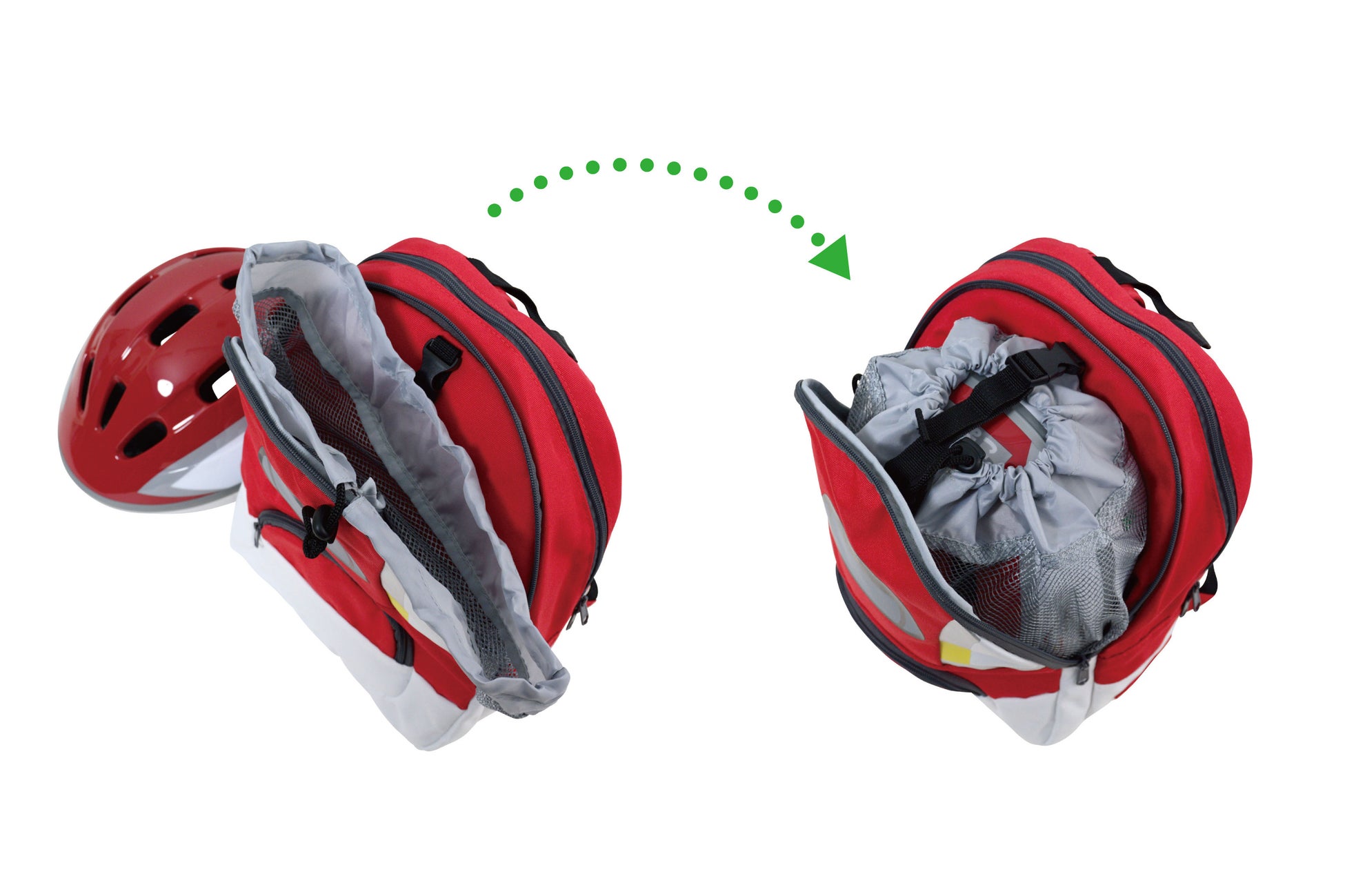 安全性と機能性を兼ね備えたこのリュックは、ヘルメットがすっぽり入る大容量の荷室を完備。自転車で出かけてその後徒歩での移動やサイクリングなど、遊び中や遊び終わった後もヘルメットの収納に困ることなく、スマートに持ち運べます。