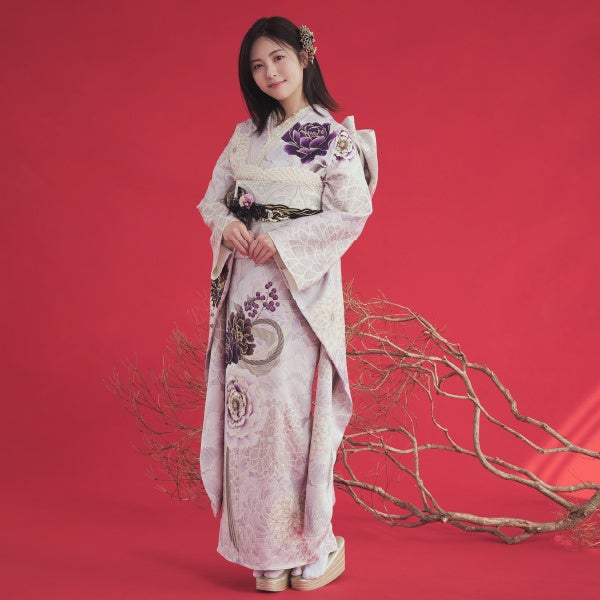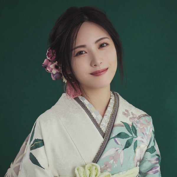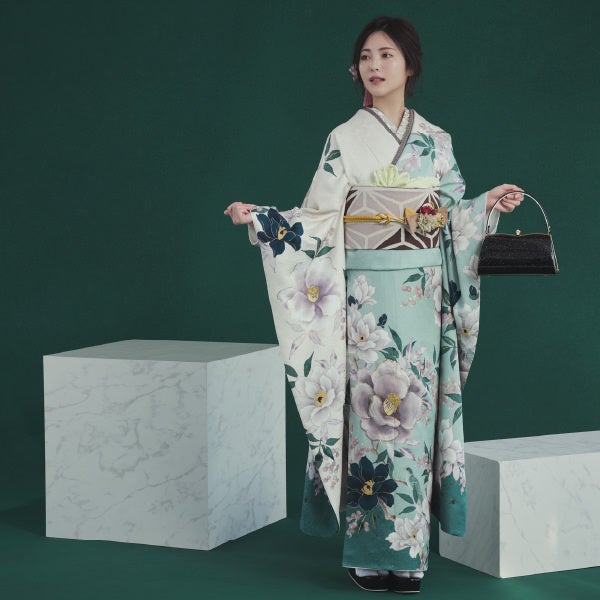 2023年トレンドカラーのグリーン&ピンクの地色の振袖に、なじみの良いグレイッシュやモノトーンの小物を合わせた洗練されたスタイル。2色の染め分けや地紋起こしなどの特長に加え、金糸を柄に丁寧にはわせて綴糸で留めていく「金駒刺繍」、金銀色箔や金粉を施した「金彩加工」など、職人により長年継承されてきた伝統技法を随所に感じられる振袖をぜひご覧ください。