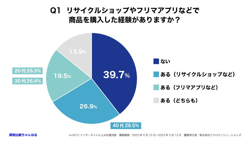 そこで、株式会社アクロスソリューションズと株式会社浜屋が共同運営している買取比較ちゃんねる(URL:https://www.hamaya-corp.co.jp/media )は、15歳〜60歳以上の男女2412人を対象に「中古品の購入に関する意識調査」を実施しました。