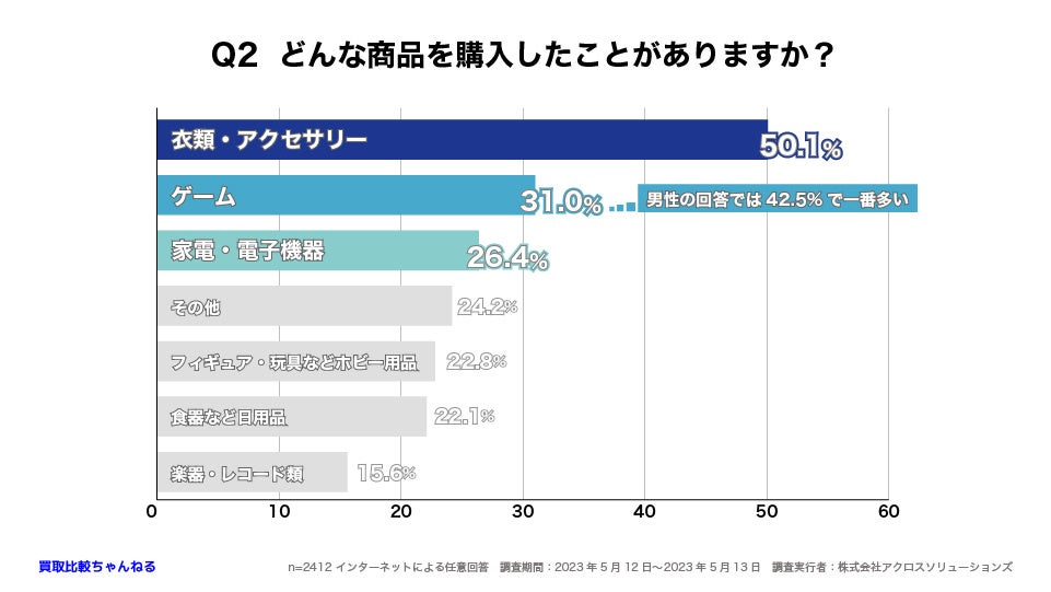 Q2 中古品購入の経験がある人のうち、およそ半数の人が「衣類・アクセサリー」を購入したことがありました。また男性の場合はゲームの中古購入経験が最も多い結果となりました。