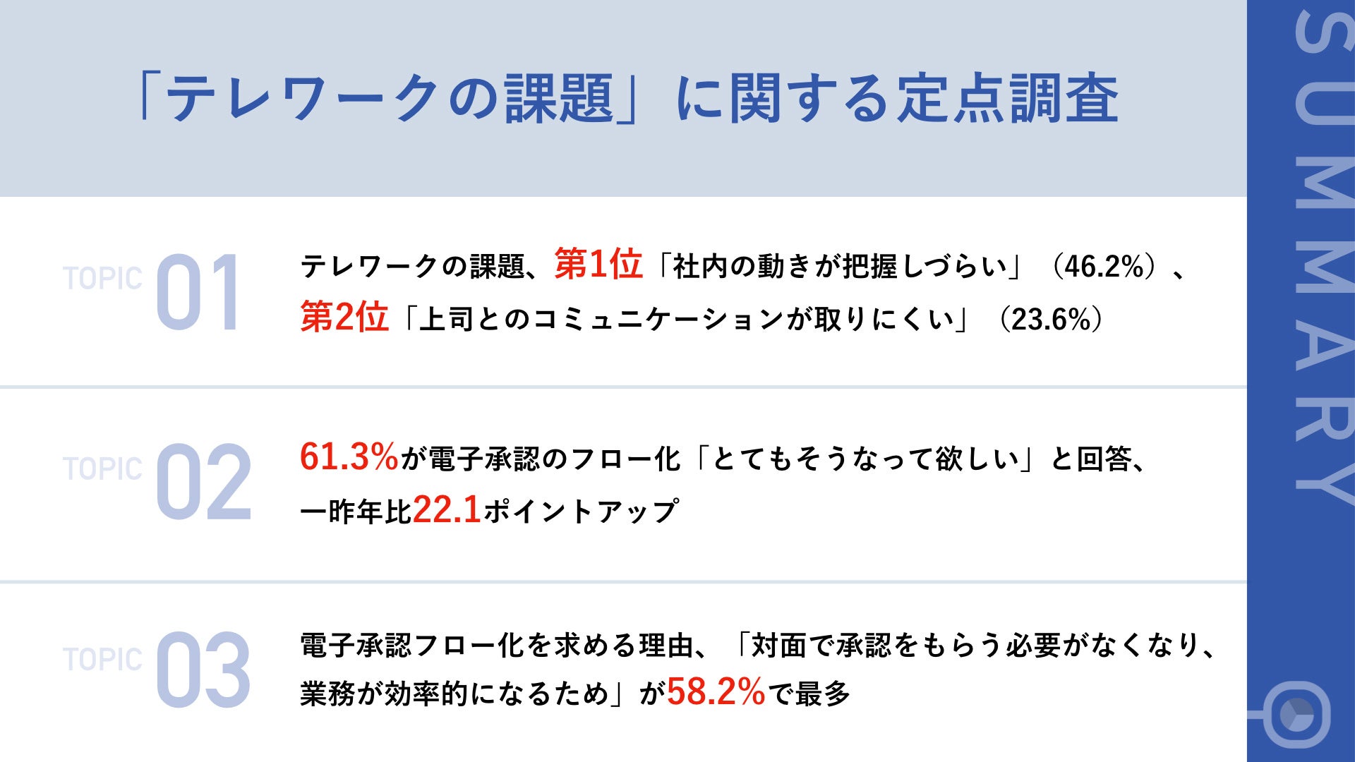 【テレワーク推進から2年、その課題は?】第1位「社内の動きが把握しづらい」、第2位「コミュニケーションが取りにくい」 6割以上から「承認フローを電子化してほしい」との声
