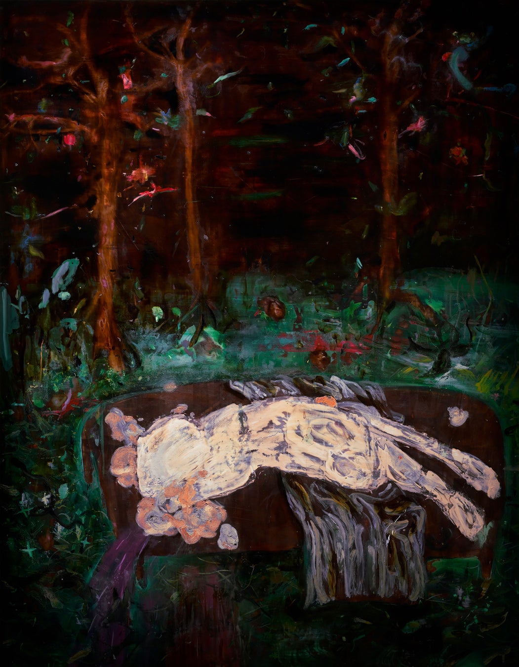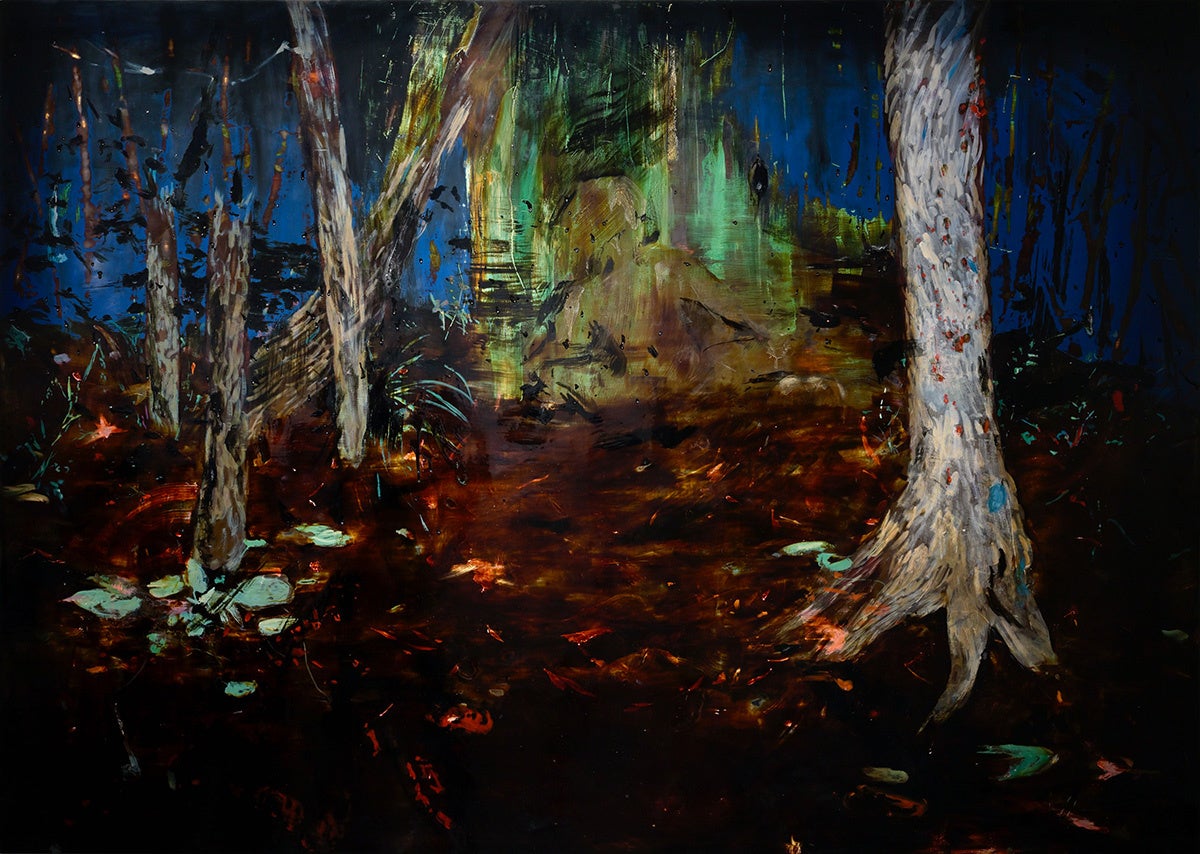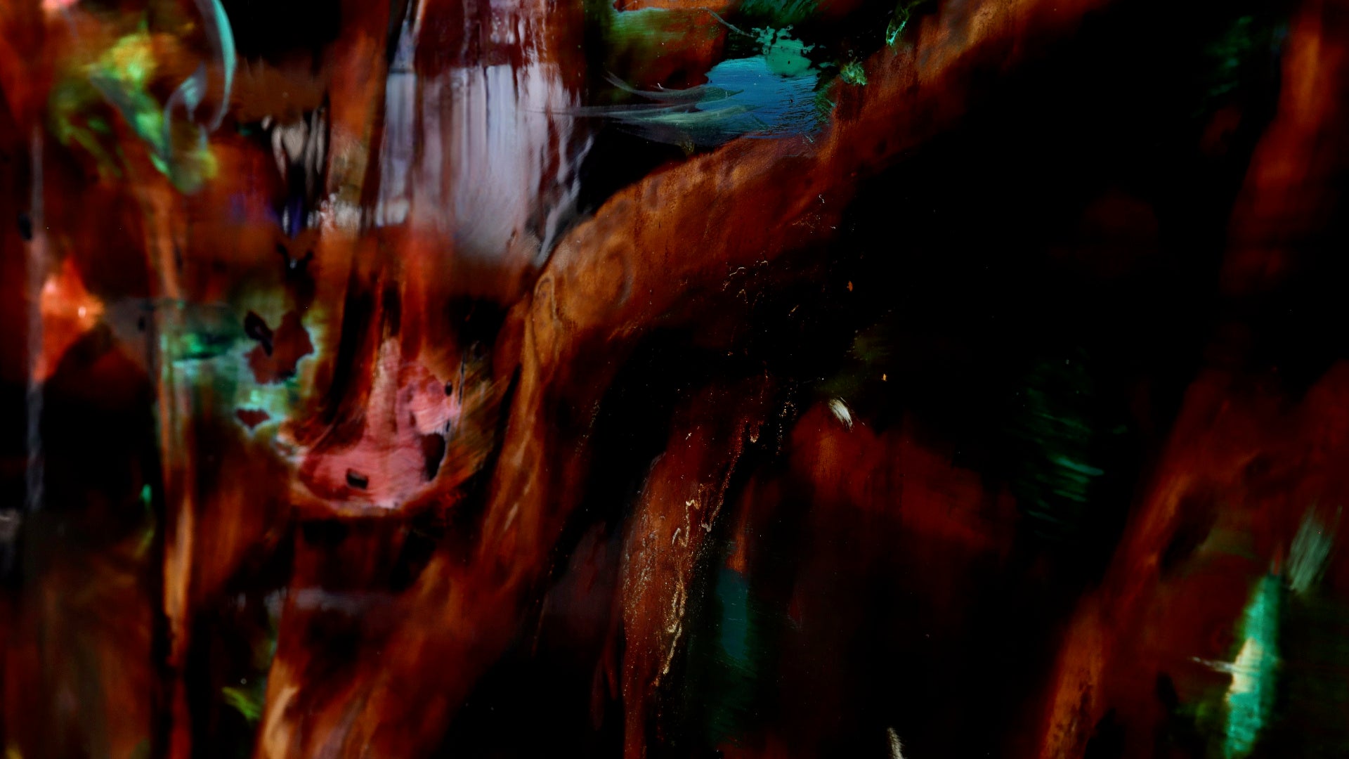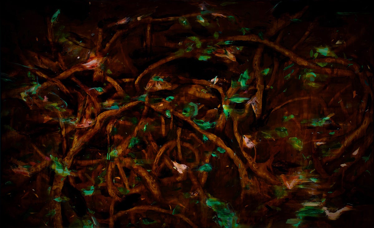 漆の絵では、表面の光沢や磨かれた鏡面の反射、透明感を帯びた色彩層、混ぜ合わされた土や金属粉の素材感が、描かれたイメージと共に目に飛び込んできます。そこではしばしばイメージが覆い隠す、絵画の肉体としての“ものそのものの存在”が強調されます。私は漆を介して人為的なものの背後にある非人間的な存在に注意を払うようになりました。クマ財団の支援を受けた2024年1月の展示では、気配に感覚を開く場として会場を暗い洞穴に見立てましたが、今回の展示では材料と制作者との間で交わされる傷の交換にを手掛かりに、人ならざるものとの繋がりについて考えたいと思います。