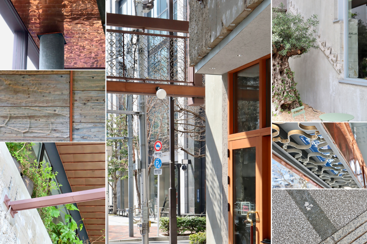 再開発によって誕生した新築ビル(KABUTO ONE)と隣り合う角地に面する兜町第7平和ビル。変化を続けるこの街で、人が滞留する風景を創出するため、道行く人に開かれたオープンスペースを創り出した。銀行として使われていた本建物の屋内空間を用途変更にて店舗化するとともに一部屋外化。既存部材や撤去された階段の跡はそのままに、植物模様の手摺金具や花崗岩の床材、かつての住居表示板を再加工している。更に近隣の新築ビル(KITOKI)で使用された木の型枠を再活用するのに加え、日本橋川の水面のイメージから銅板の天井素材を取り入れ、エリア内での循環を意匠として表現している。ベンチやカウンターなども配置し、誰もが立ち寄りやすいスペースとすることで待ち合わせや談笑、購入したブレッドやコーヒーを食したりと、多様な動きが生まれる空間とした。