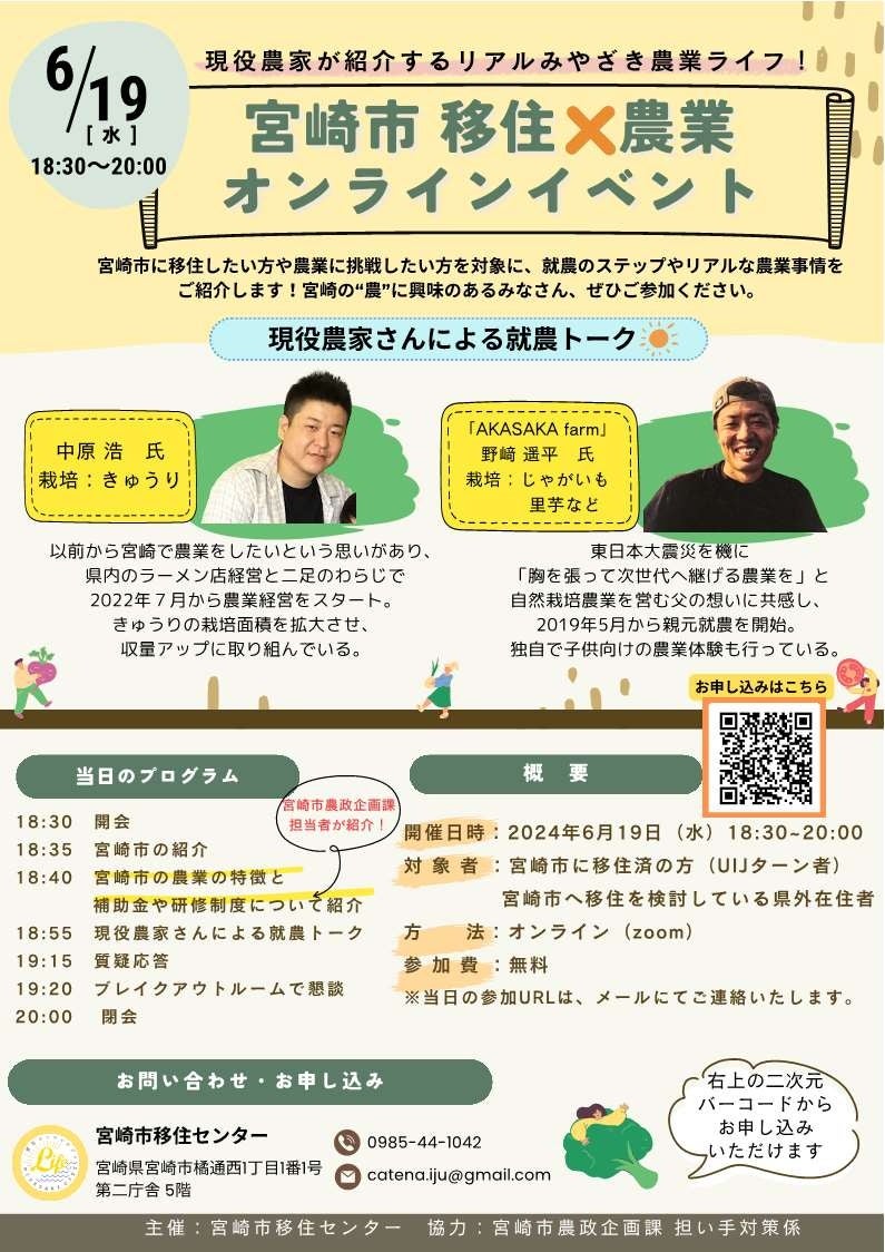 宮崎市に移住したい方や農業に挑戦したい方を対象に、就農のステップやリアルな農業事情をご紹介します!宮崎の“農”に興味のあるみなさん、ぜひご参加ください。