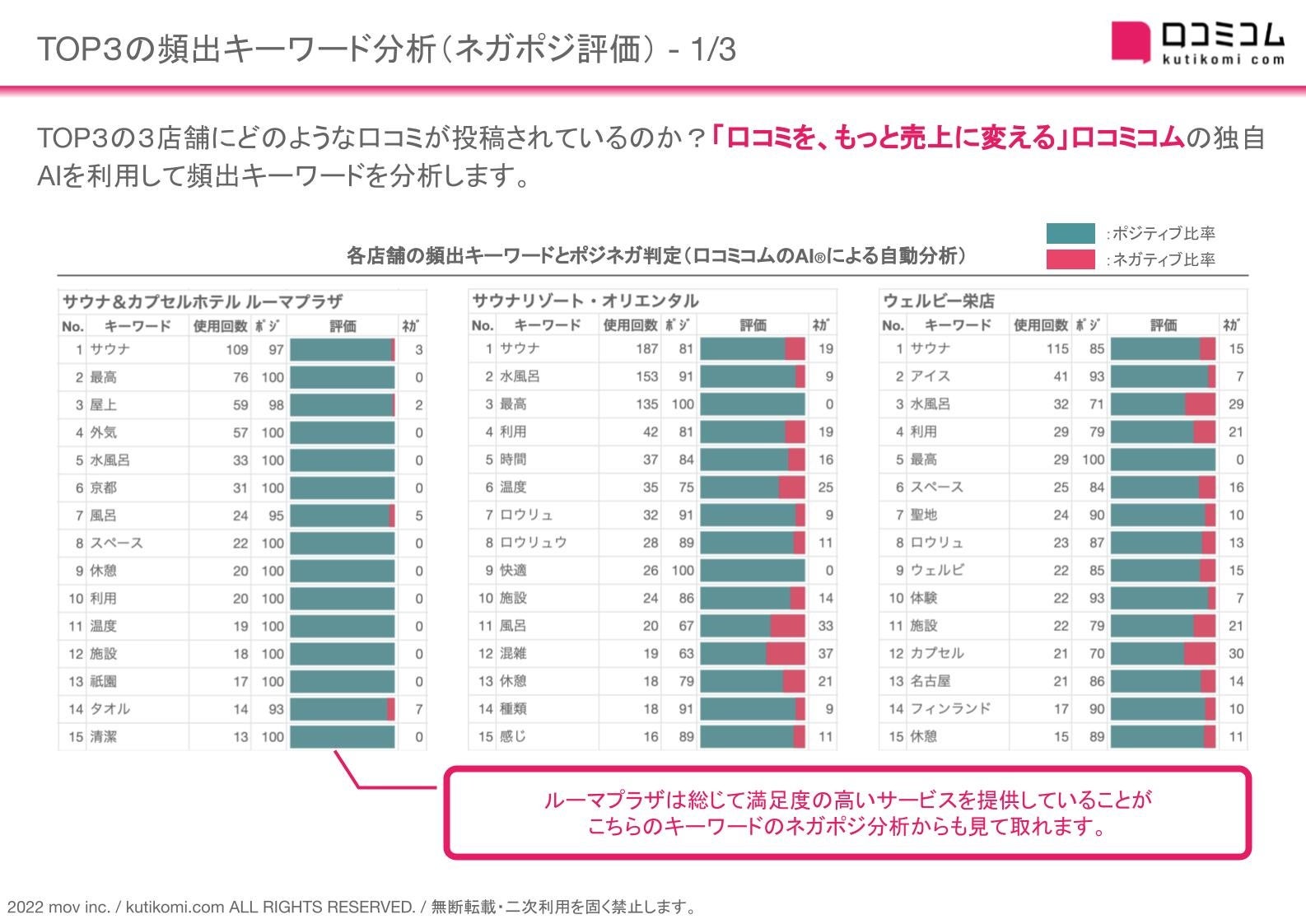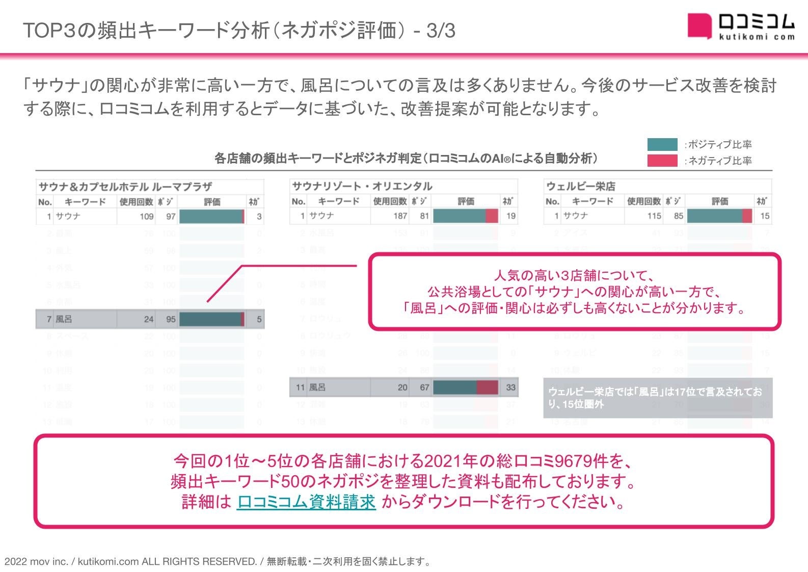 お客様の声のDXサービス「口コミコム」を運営する株式会社mov(代表取締役:渡邊 誠、本社:東京都渋谷区、以下mov)は、「口コミコム」独自の「分析機能」を用い、全国TOP110店舗を対象に「銭湯・サウナ業界」の口コミ分析レポートを作成しました。