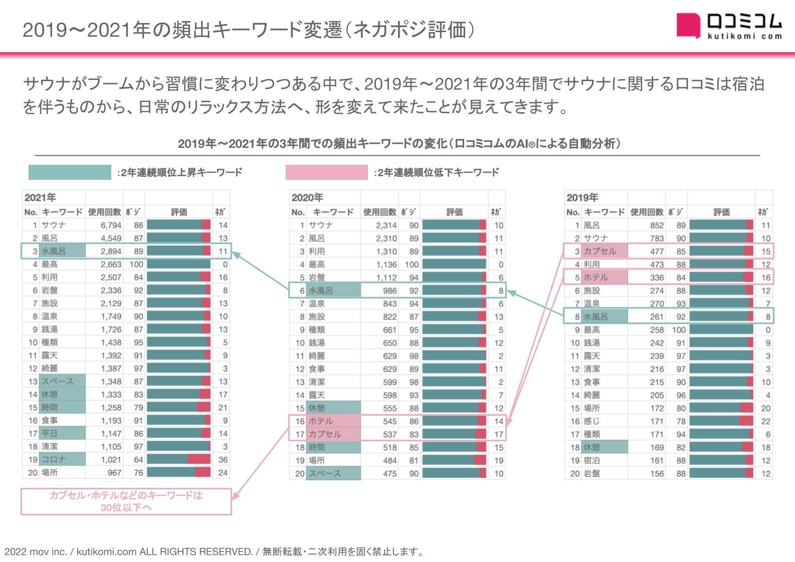 また、2019〜2021年の頻出キーワードの変遷を見ていくと、サウナがブームから習慣に移行しつつある中で、2019年〜2021年の3年間でサウナに関する口コミは宿泊を伴うものから、日常のリラックス方法へ、形を変えて来たことも見えてきました。