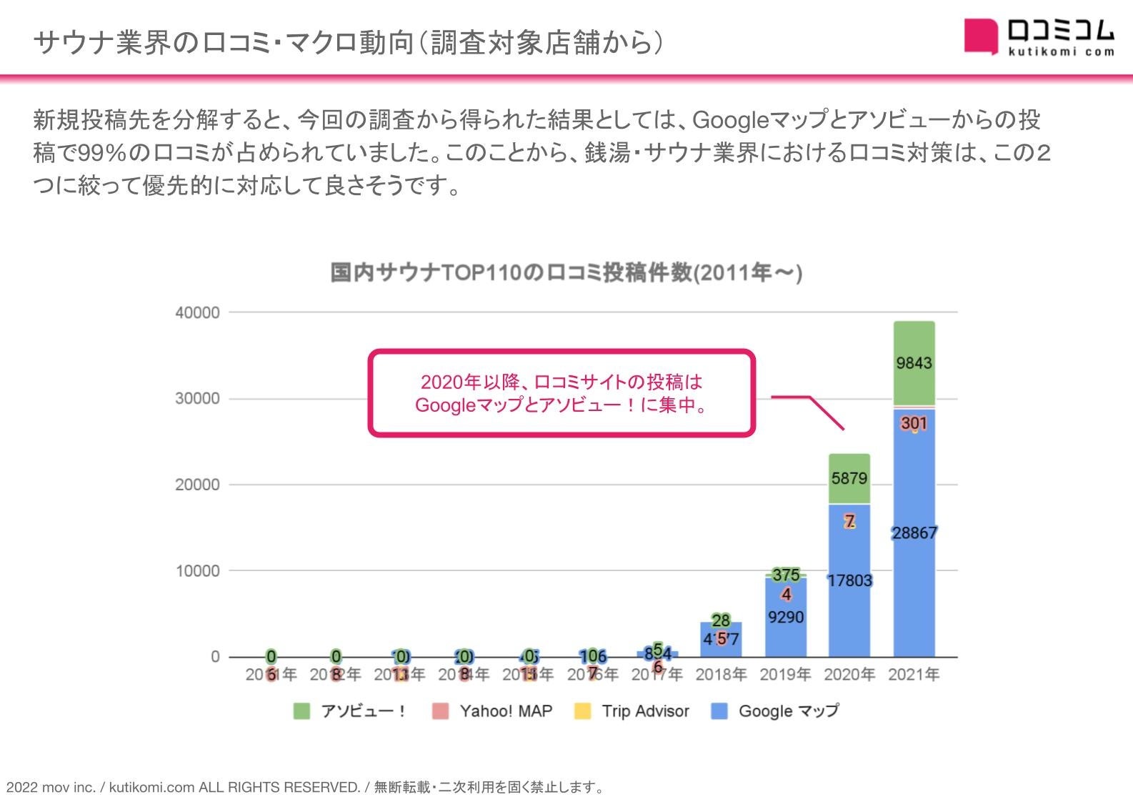 また、今回の調査によると、新しい口コミはGoogleマップとアソビューへの投稿が99%を占めています。今後の銭湯・サウナ業界における口コミ対策はこの2つを優先的に行うのが効果的だと思われます。