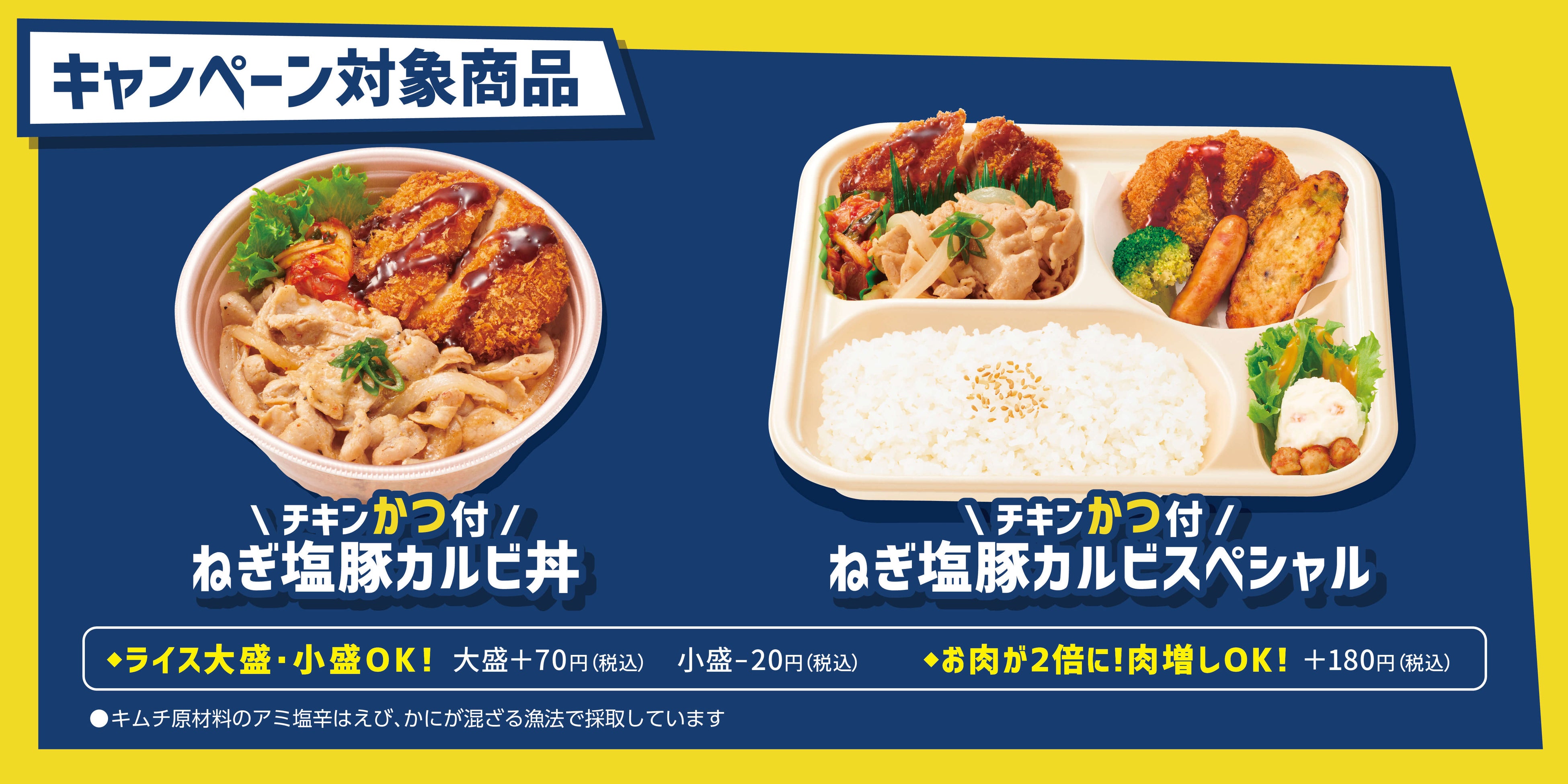 「ヒーローは食べてかつ」のタイトルになぞらえキャンペーン対象商品は、チキン「かつ」付 ねぎ塩豚カルビシリーズ。ほっかほっか亭が誇る白ごはんの上に、店仕込みのチキンかつと人気のねぎ塩豚カルビをトッピング。箸休めのキムチにまでこだわった自慢の逸品です。また、カレーコロッケ、ウィンナー、お好み天、ブロッコリーが一緒の「ねぎ塩豚カルビスペシャル」も対象です。是非、この 機会にご賞味ください。