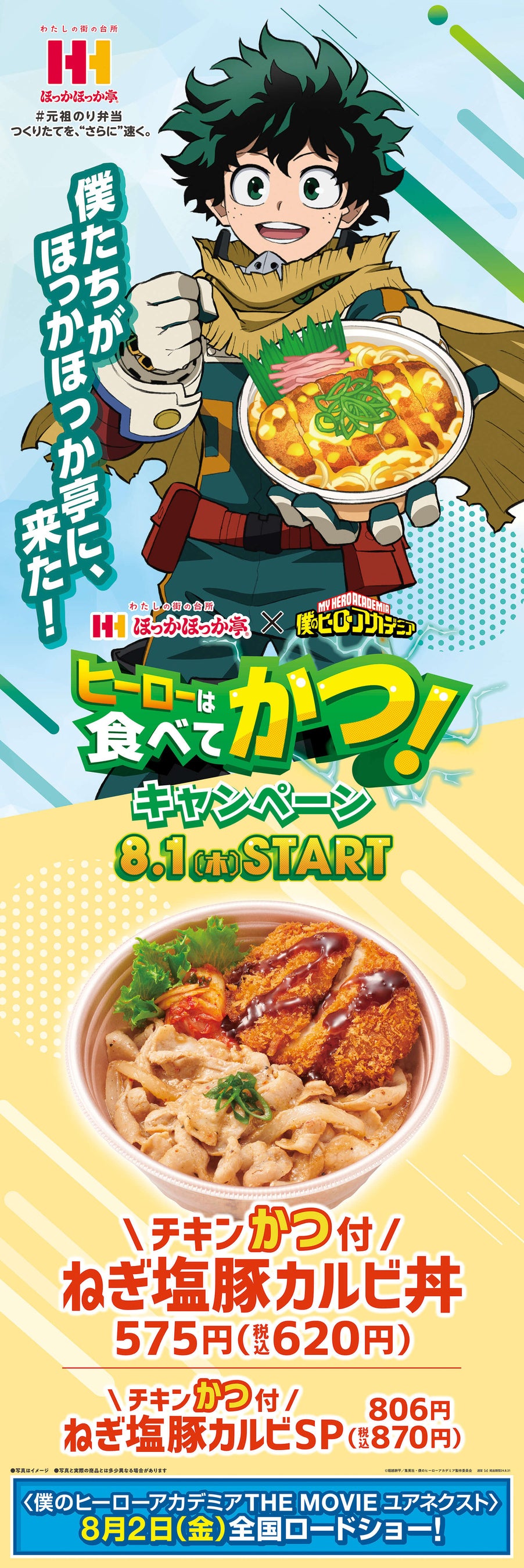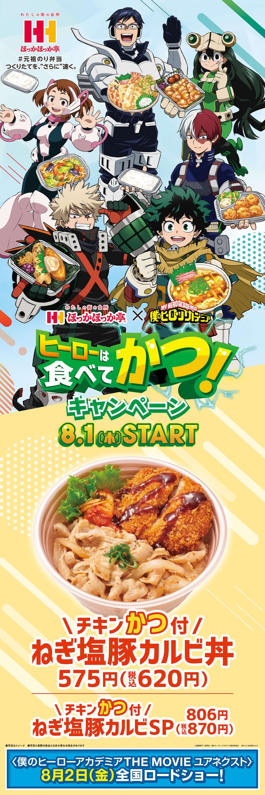 持ち帰り弁当のパイオニア「ほっかほっか亭」が、あの人気TVアニメ「僕のヒーローアカデミア」とアッツアッツのコラボレーション。完全オリジナルの描きおろしを採用し、この夏、最もアツいキャンペーンに!!