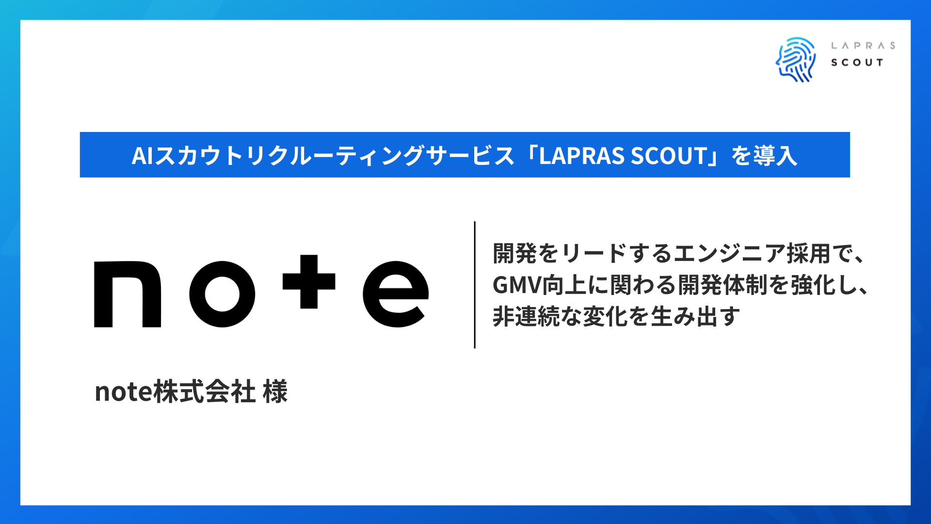 LAPRAS SCOUTは、特にハイスキルで成長意欲の高いエンジニアの採用を実現するサービスです。note株式会社は、プラットフォームのGMV(*2)向上に関わる開発体制の強化、ユーザーとクリエイターにとっての価値拡大を実現するため、開発をリードしていくエンジニア人材採用を目的としてLAPRAS SCOUTを採用されました。LAPRAS SCOUTの運用代行サービスである「LAPRAS SCOUT PRO」も併用いただいております。