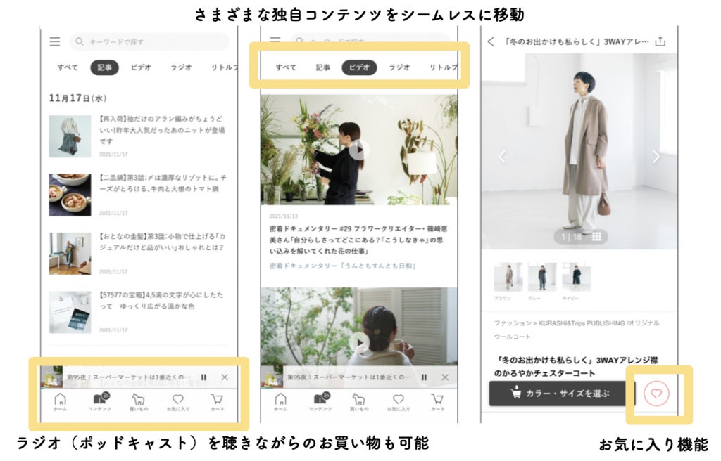 特徴: アプリ上で商品の購入から、ウェブ記事や動画・音声コンテンツの視聴などをシームレスに利用することができます。スマホアプリでは、全コンテンツを一覧化してブックマークできる 「お気に入り機能」を搭載しています。気になる商品を登録し て後からじっくり検討したり、動画コンテンツで作ってみたいレシピを保存したりすることで、“暮らし”に関連する様々なコンテンツを楽しむことができます。