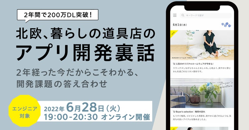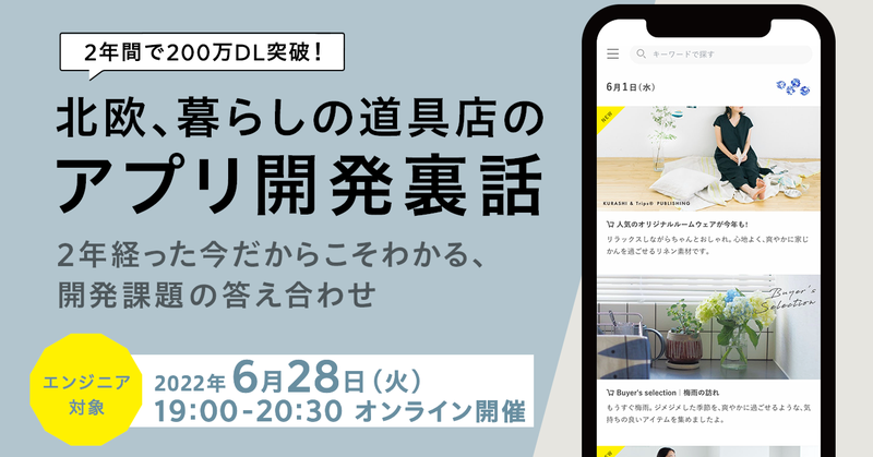 スタートから2年を迎えた「北欧、暮らしの道具店」のスマホアプリ、その200万DLを記念して、初のエンジニアによるトークイベント「Kurashicom Tech Talk」を2022年6月28日(火)に開催します。テーマは「2年経った今だからこそわかる、開発課題の答え合わせ」。アプリ開発を担当したシニアエンジニアの廣瀬と、UI/UXデザイナー兼開発チームマネージャー村田の2名が登壇いたします。