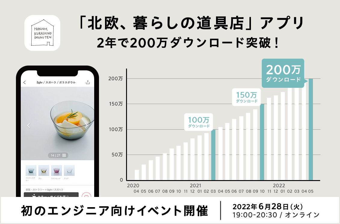 株式会社クラシコム(本社:東京都国立市、代表取締役:青木耕平)が提供するライフカルチャープラットフォーム「北欧、暮らしの道具店 URL:https://hokuohkurashi.com/ 」のスマホアプリ(iOS・Android)が、2020年4月のAndroid版提供開始から、約2年で200万ダウンロードを突破したことをお知らせします。これを記念して、クラシコム初の開発担当者によるトークイベント「Kurashicom Tech Talk」を、2022年6月28日(火)に開催いたします。当日は、アプリ開発を担当したクラシコム社員2名が登壇し、開発者による現場課題やその解決のプロセスについてお話しします。