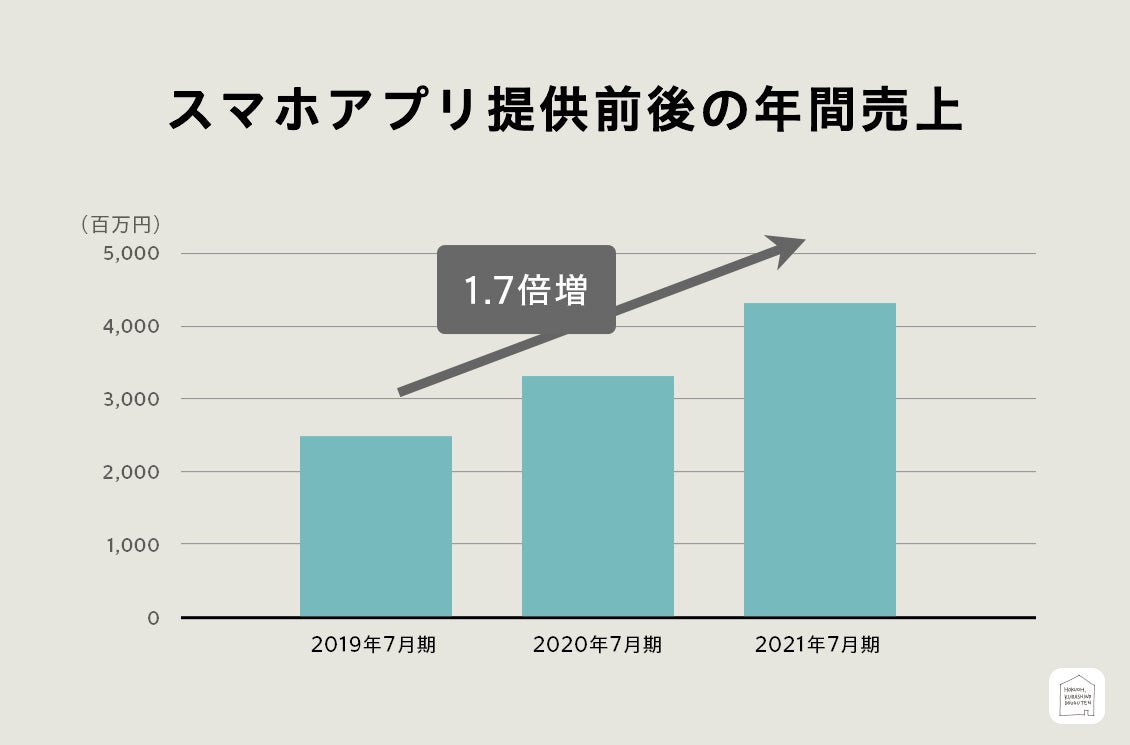 スマホアプリは売上向上にもつながっており、アプリ提供前の2019年7月期の売上27.4億円に対し、アプリ提供後の2021年7月期には 年間売上が約1.7倍増の45.3億円 となっています。