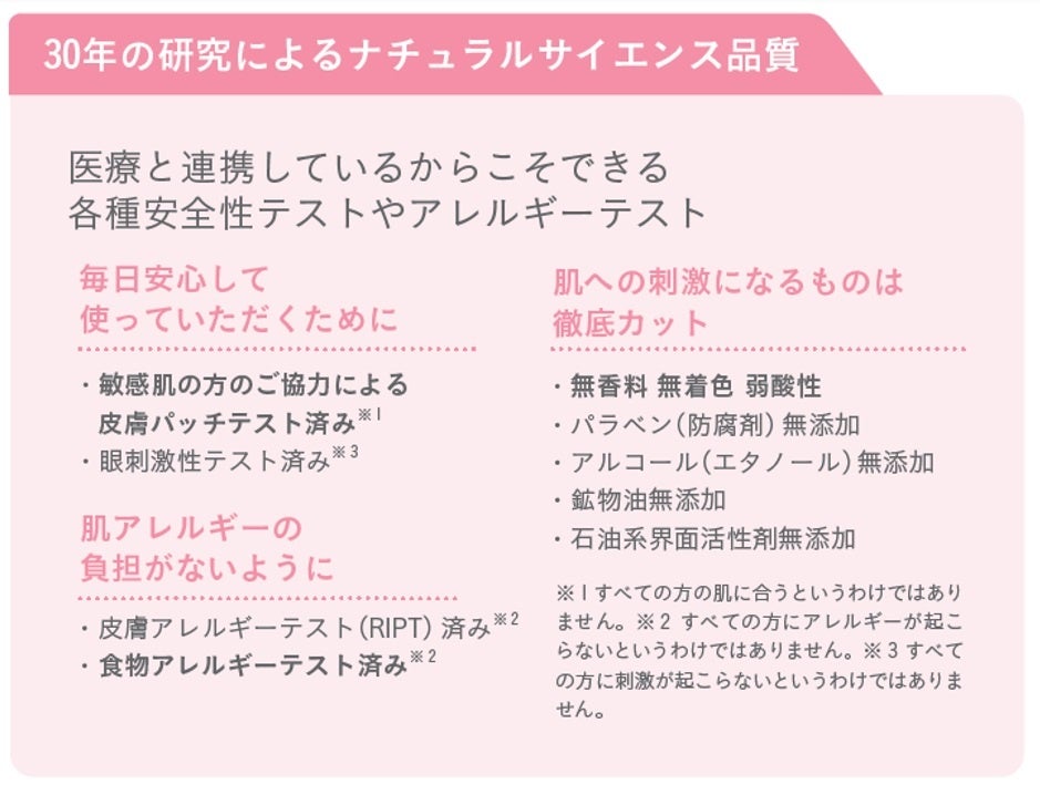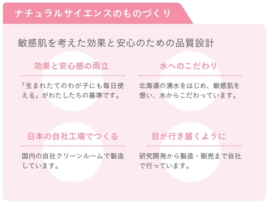 低刺激スキンケアメーカーのナチュラルサイエンスは、30年にわたり世界一デリケートな赤ちゃんの肌を研究し続けてまいりました。そんなデリケートな赤ちゃんから敏感肌の大人まで一緒に使える低刺激のスキンケアを中⼼に、肌本来の⼒を引き出すスキンケアやサプリメントなどの研究開発・販売を⾏っています。特に敏感肌向けブランド「ママ&キッズ」は⽪膚科医・⼩児科医・産婦⼈科医・アレルギー専門医の協⼒のもと開発を⾏い、低刺激性を実現。またその効果を確かめるため、⼤学病院や⽪膚科での臨床テストを実施するなど、徹底的に品質をチェックしています。