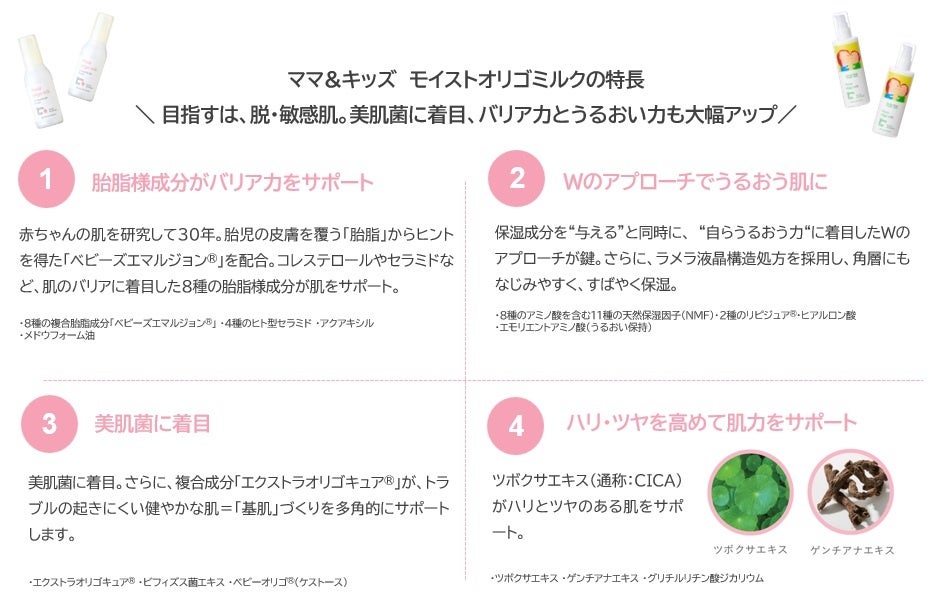 大賞作品がプリントされた「ママ&キッズ モイストオリゴミルク」は、赤ちゃんの肌を研究して30年、乾燥や肌荒れをくりかえす肌をうるおいでバリアする敏感肌用保湿乳液です。「胎脂」からヒントを得た「ベビーズエマルジョン®」を配合、ベールのように肌を守り、内側からふっくら弾むようなツヤ肌に導きます。プレ&プロバイオティクス発想で美肌菌に着目した「エクストラオリゴキュア®」や、肌のハリを高めるツボクサエキスも配合。みずみずしくスーッとなじんで、やさしく肌に密着する軽やかな使い心地。赤ちゃんにも使える低刺激処方で、お肌が敏感に傾きがちな妊婦さんや敏感肌の大人の方まで幅広く使えます。