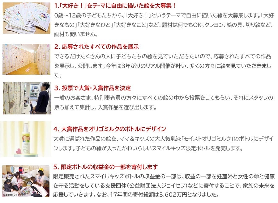 子どもたちから「大好き!」をテーマにした絵を募集し、大賞作品は同社の商品パッケージに使用。限定商品として発売し、その収益の一部を妊産婦と女性の命と健康を守る活動をしている支援団体(公益財団法人ジョイセフ)や、認定NPO法人全国こども食堂支援センター・むすびえ等へ寄付することで、家族の未来を応援していきます。