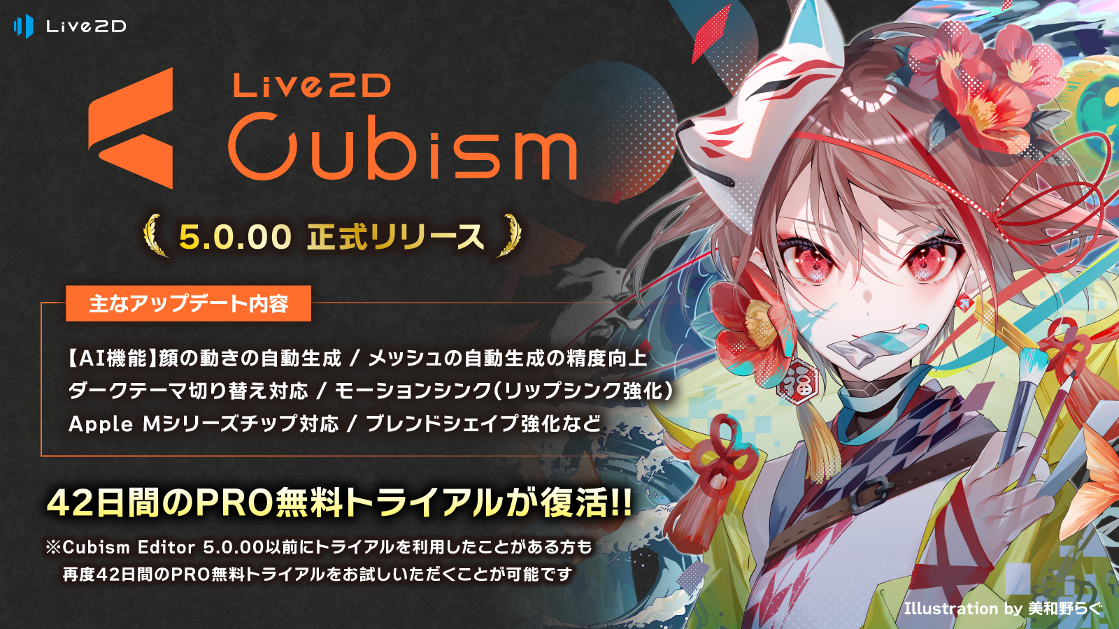 また、Cubism 5のリリースを記念してPROライセンスの25%OFFセールや、nizima LIVE、Live2D JUKUとの連動キャンペーンを実施します。