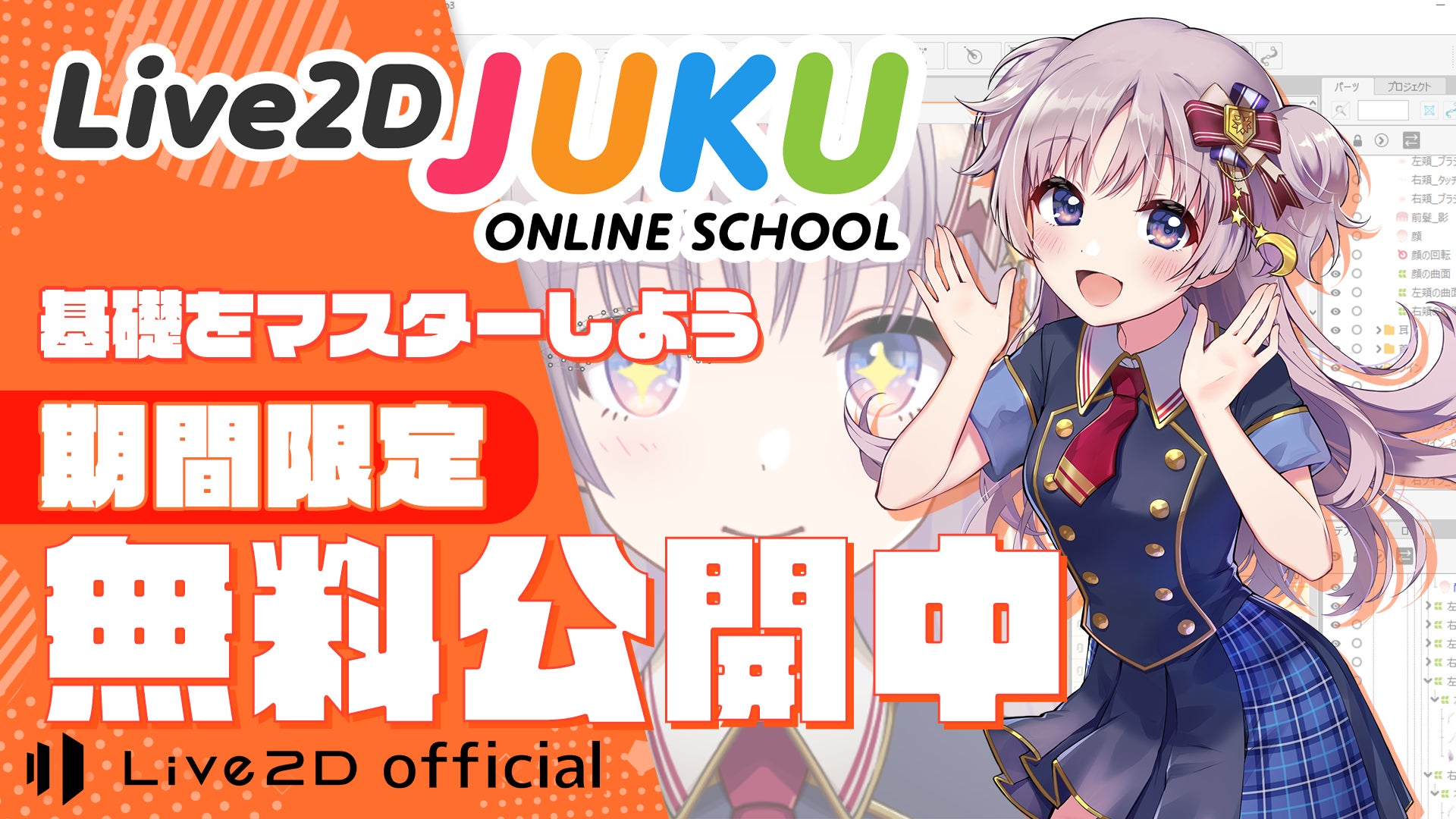 2023年9月21日(木)~11月30日(木)のの71日間限定で、Live2Dのプロになるためのオンライン講座『Live2D JUKU』の有料講座「Live2Dの基礎をマスターしよう(全12本)」を無料公開いたします!
