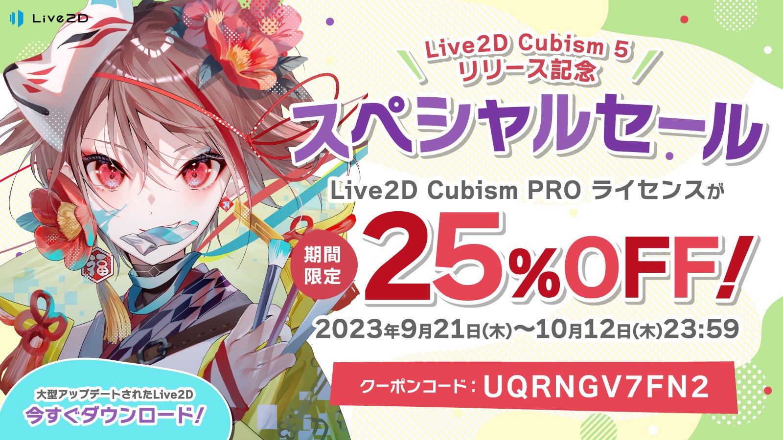 2023年9月21日(木)〜10月12日(木)の22日間限定で『Live2D Cubism PRO』が25%OFFでご購入いただけるクーポンを配布します!