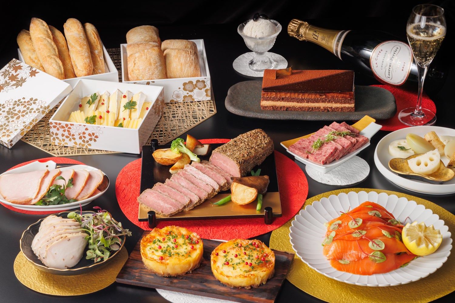 ホテルオリジナルの野菜のピクルス、ケーキにジェラート、神戸肉の名店「旭屋」の神戸ビーフのローストビーフ、神戸ポークのロースハム、丹波地鶏のハム、焼きソーセージ、神戸牛とポテトのアッシュパルマンティエ、丹波婦木農場からは蔵熟成ゴーダチーズと白カビのブリー、その他サーモン、パン2種の贅沢な全11品目。更に世界屈指のシャンパーニュメゾンから「ローラン・ペリエラキュベ」1本をセットにした豪華なおせちです。