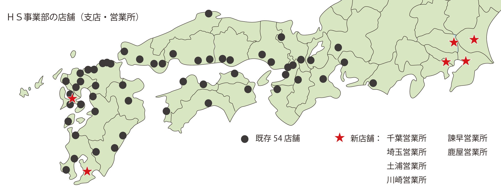 2021年5月24日発表した当ビジョンでは、2030年までにHS事業部における店舗数を倍増し、人員も大幅に増員していく計画です。これまで西日本に集中していた営業エリアを、東日本を含む全国へと拡大し、さらなるサービスの拡充をはかってまいります。