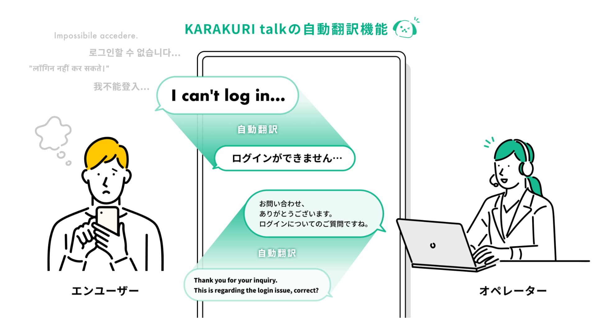 コールセンター・コンタクトセンター向けに特化したチャットツール「KARAKURI talk」に、自動翻訳機能のオプションを追加いたしました。DeepLもしくはGoogle翻訳※とのAPI連携により実現できる機能のため、対応言語のニーズに合わせてお選びいただけます。