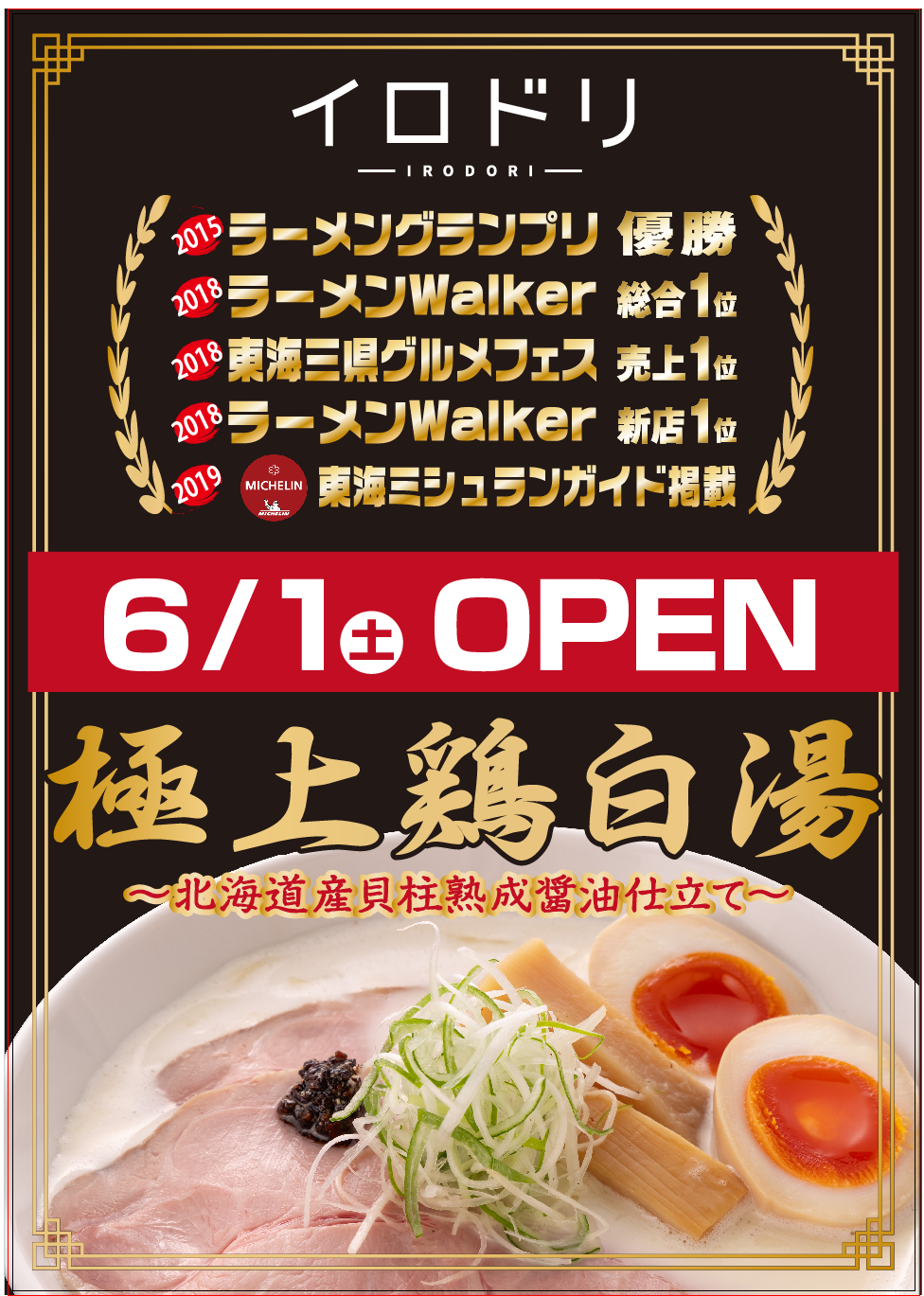 6月1日から「POPUPラーメン」の第5弾として東海ミシュランガイド2019掲載店「イロドリ」が出店いたします。